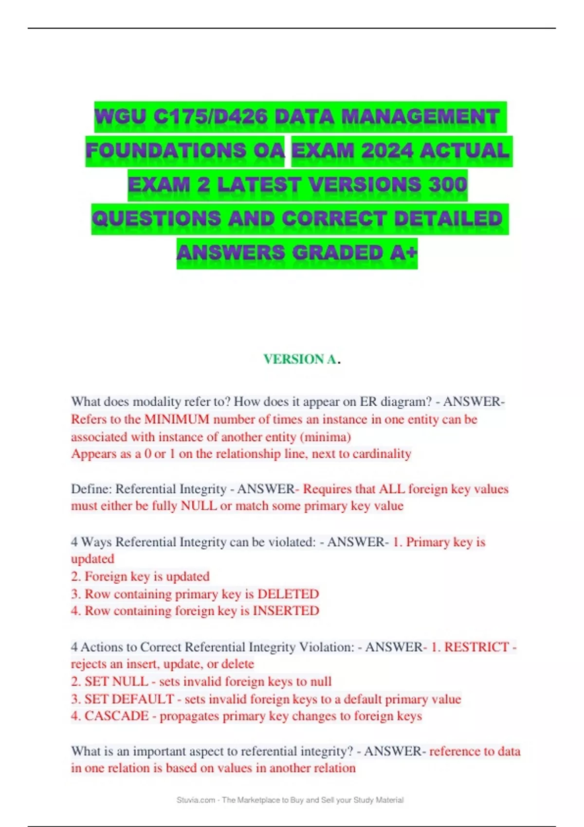 WGU C175/D426 DATA MANAGEMENT FOUNDATIONS OA EXAM 2024 ACTUAL EXAM 2 LATEST VERSIONS 300 QUESTIONS AND CORRECT DETAILED ANSWERS GRADED A+ VERSION A. What does modality refer to? How does it appear on ER diagram? - ANSWER- Refers to the MINIMUM number of times an instance in one entity can be associated with instance of another entity (minima) Appears as a 0 or 1 on the relationship line, next to cardinality Define: Referential Integrity - ANSWER- Requires that ALL foreign key values must either be fully NULL or match some primary key value 4 Ways Referential Integrity can be violated: - ANSWER- 1. Primary key is updated 2. Foreign key is updated 3. Row containing primary key is DELETED 4. Row containing foreign key is INSERTED 4 Actions to Correct Referential Integrity Violation: - ANSWER- 1. RESTRICT - rejects an insert, update, or delete 2. SET NULL - sets invalid foreign keys to null 3. SET DEFAULT - sets invalid foreign keys to a default primary value 4. CASCADE - propagates primary key changes to foreign keys What is an important aspect to referential integrity? - ANSWER- reference to data in one relation is based on values in another relation What is a broad definition of data? - ANSWER- Raw facts captured on printed or digital media What are data? - ANSWER- Facts that are collected and stored in a database system What is a determining characteristic of unstructured data? - ANSWER- It does not follow a data model What is true about flat files? - ANSWER- - They contain no internal hierarchical organization How were data retrieved before database management systems? - ANSWER- Sequentially from simple files What is an attribute or group of attributes that uniquely identify a tuple in a relation? - ANSWER- Primary Key What is necessary for a primary key in one relation of a database to match with its corresponding foreign key in another relation of the same database? - ANSWER- A domain of values What uniquely identifies each entity in a collection of entities but is not the primary key? - ANSWER- Alternate Key What is the term for a set of columns in a table that can uniquely identify any record in that table without referring to other data? - ANSWER- Candidate Key What happens to the original data in database indexing? - ANSWER- It is copied to the index Why are indexes created in a physical database design? - ANSWER- To retrieve data DIRECTLY using a pointer Why is an index created on a database column? - ANSWER- To optimize data retrievals Define: Functional Dependency - ANSWER- Each value of a column relates to at MOST one value of another column