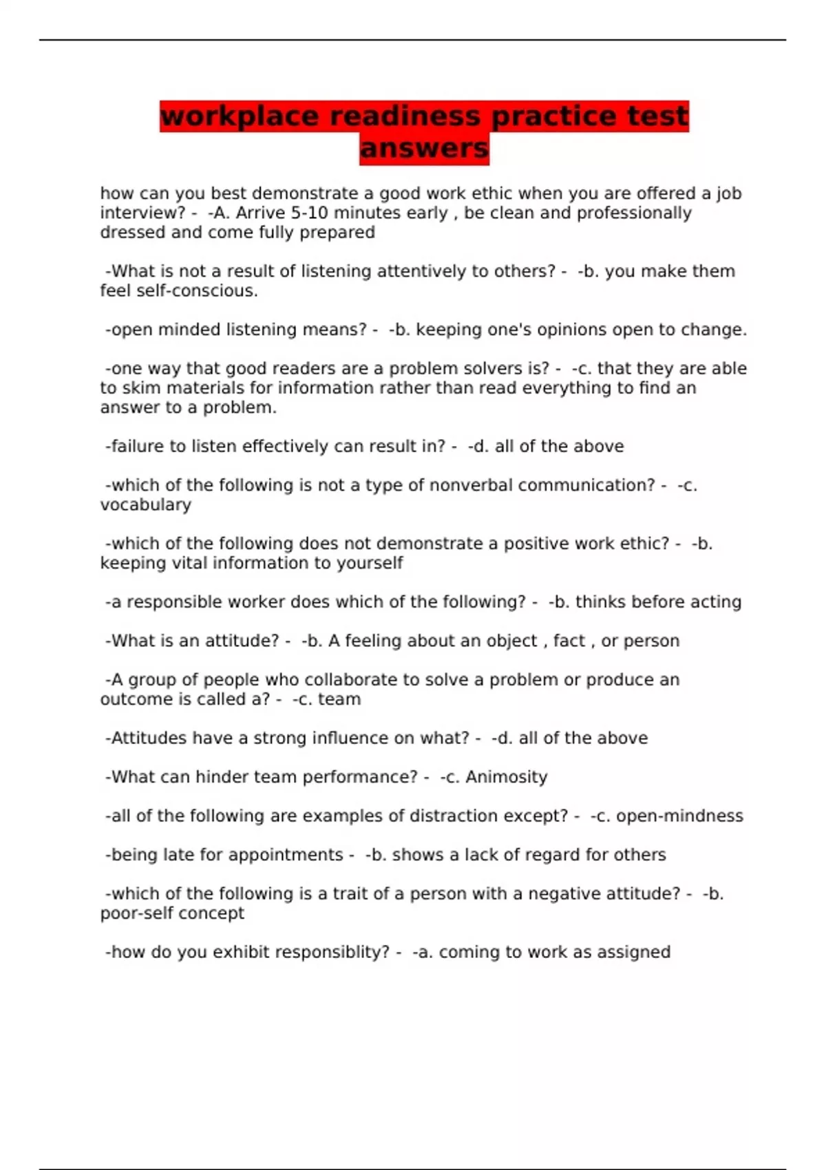 workplace readiness practice test answers