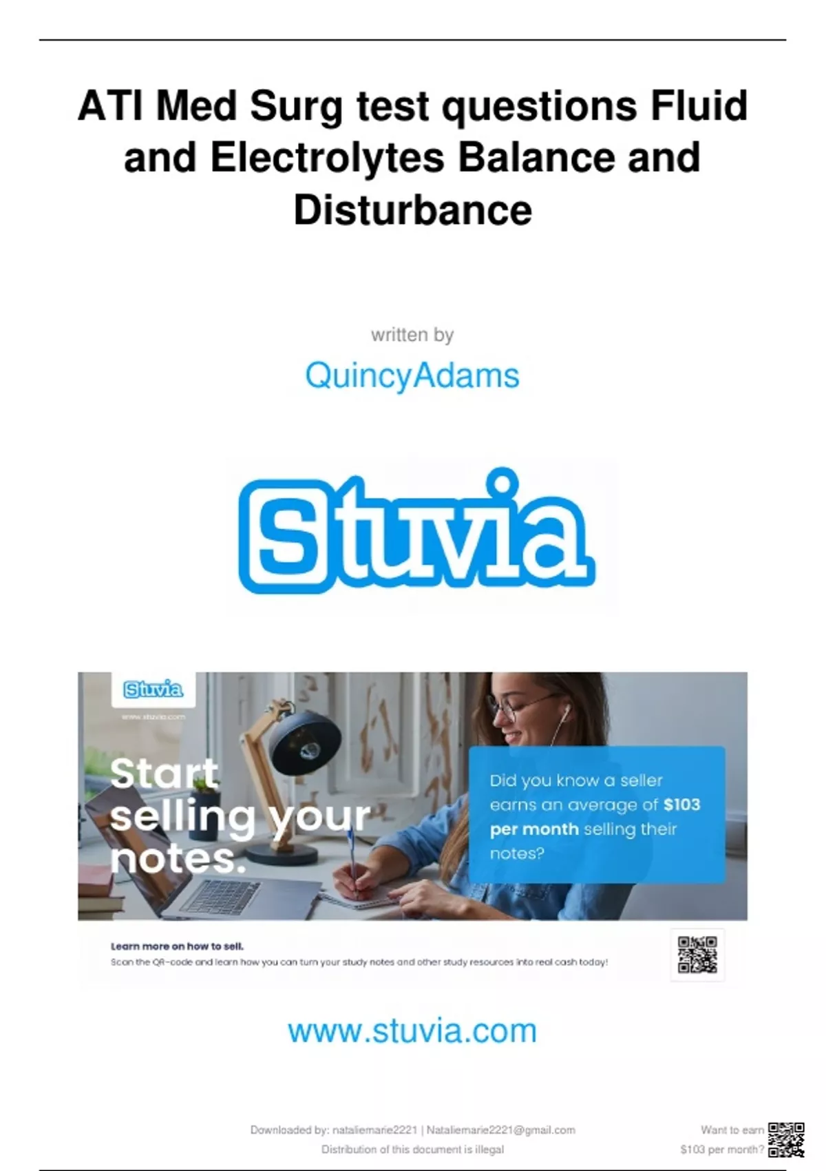 ATI MED SURG FLUIDS AND ELECTROLYTES BALANCE AND DISTURBANCES QUESTIONS & ANSWERS LATEST 2021/2022 COMPLETE SOLUTION Answer Key Question 1: (see full question) An elderly client takes 40 mg of Lasix twice a day. Which electrolyte imbalance is the most serious adverse effect of diuretic use? You selected: Hypokalemia Correct Explanation: Hypokalemia (potassium level below 3.5 mEq/L) usually indicates a defict in total potassium stores. Potassium-losing diuretics, such as loop diuretics, can induce hypokalemia. Reference: Hinkle, J.L., and Cheever, K.H. Brunner & Suddarth's Textbook of Medical-Surgical Nursing, 13th ed. Philadelphia: Lippincott Williams & Wilkins, 2014, Chapter 13: Fluid and Electrolytes: Balance and Disturbance, p. 255. Chapter 13: Fluid and Electrolytes: Balance and Disturbance - Page 255 Question 2: (see full question) The nurse is reviewing client lab work for a critical lab value. Which S - The Marketplace to Buy and Sell your Study Material Downloaded by: nataliemarie2221 | Distribution of this document is illegal Want to earn $103 per month? S - The Marketplace to Buy and Sell your Study Material value is called to the physician for additional orders? Correct response: Potassium: 5.8 mEq/L Explanation: Normal potassium level is 3.5 to 5.5 mEq/L. Elevated potassium levels can lead to muscle weakness, paresthesias, and cardiac dysrhythmias. Reference: Hinkle, J.L., and Cheever, K.H. Brunner & Suddarth's Textbook of Medical-Surgical Nursing, 13th ed. Philadelphia: Lippincott Williams & Wilkins, 2014, Chapter 13: Fluid and Electrolytes: Balance and Disturbance, p. 254. Chapter 13: Fluid and Electrolytes: Balance and Disturbance - Page 254 Question 3: (see full question) A client with pancreatic cancer has the following blood chemistry profile: Glucose, fasting: 204 mg/dl; blood urea nitrogen (BUN): 12 mg/dl; Creatinine: 0.9 mg/dl; Sodium: 136 mEq/L; Potassium: 2.2 mEq/L; Chloride: 99 mEq/L; CO2: 33 mEq/L. Which result should the nurse identify as critical and report immediately? You selected: Potassium Correct Explanation: The nurse should identify potassium: 2.2 mEq/L as critical because a normal potassium level is 3.8 to 5.5 mEq/L. Severe hypokalemia can cause cardiac and respiratory arrest, possibly leading to death. Hypokalemia also depresses the release of insulin and results in glucose intolerance. The glucose level is above normal (normal is 75 to 110 mg/dl) and the chloride level is a bit low (normal is 100 to 110 mEq/L). Although these levels should be reported, neither is life-threatening. The BUN (normal is 8 to 26 mg/dl) and creatinine (normal is 0.8 to 1.4 mg/dl) are within normal range. (less) Downloaded by: nataliemarie2221 | Distribution of this document is illegal Want to earn $103 per month? S - The Marketplace to Buy and Sell your Study Material 3 3 Reference: Hinkle, J.L., and Cheever, K.H. Brunner & Suddarth's Textbook of Medical-Surgical Nursing, 13th ed. Philadelphia: Lippincott Williams & Wilkins, 2014, Chapter 13: Fluid and Electrolytes: Balance and Disturbance, p. 255. Chapter 13: Fluid and Electrolytes: Balance and Disturbance - Page 255 Question 4: (see full question) Which nerve is implicated in the Chvostek’s sign? You selected: Facial Correct Explanation: Chvostek’s sign consists of twitching of muscles supplied by the facial nerve when the nerve is tapped about 2 cm anterior to the earlobe, just below the zygomatic arch. Reference: Hinkle, J.L., and Cheever, K.H. Brunner & Suddarth's Textbook of Medical-Surgical Nursing, 13th ed. Philadelphia: Lippincott Williams & Wilkins, 2014, Chapter 13: Fluid and Electrolytes: Balance and Disturbance, p. 259. Chapter 13: Fluid and Electrolytes: Balance and Disturbance - Page 259 Question 5: (see full question) A client has the following arterial blood gas (ABG) values: pH, 7.12; partial pressure of arterial carbon dioxide (PaCO2), 40 mm Hg; and bicarbonate (HCO – ), 15 mEq/L. These ABG values suggest which disorder? You selected: Metabolic acidosis Correct Explanation: This client's pH value is below normal, indicating acidosis. The HCO – value also is below normal, reflecting an overwhelming accumulation of acids or excessive loss of base, which suggests metabolic acidosis. The PaCO2 value is normal, indicating absence of respiratory compensation. These ABG values eliminate respiratory alkalosis, respiratory acidosis, and metabolic alkalosis. (less) Reference: Hinkle, J.L., and Cheever, K.H. Brunner & Suddarth's Textbook of Medical-Surgical Nursing, 13th ed. Philadelphia: Lippincott Williams & Wilkins, 2014, Chapter 13: Fluid and Electrolytes: Balance and Disturbance, p. 268. Chapter 13: Fluid and Electrolytes: Balance and Disturbance - Page 268 Question 6: (see full question) The nurse is caring for a client with laboratory values indicating dehydration. Which clinical symptom is consistent with the dehydration? You selected: Dark, concentrated urine Correct Explanation: Dehydration indicates a fluid volume deficit. Dark, concentrated urine indicates a lack of fluid volume. Adding more fluid would dilute the urine. The other options indicate fluid excess. (less) Downloaded by: nataliemarie2221 | Distribution of this document is illegal Want to earn $103 per month? S - The Marketplace to Buy and Sell your Study Material Downloaded by: nataliemarie2221 | Distribution of this document is illegal Want to earn $103 per month? S - The Marketplace to Buy and Sell your Study Material Reference: Hinkle, J.L., and Cheever, K.H. Brunner & Suddarth's Textbook of Medical-Surgical Nursing, 13th ed. Philadelphia: Lippincott Williams & Wilkins, 2014, Chapter 13: Fluid and Electrolytes: Balance and Disturbance, p. 246. Chapter 13: Fluid and Electrolytes: Balance and Disturbance - Page 246 Question 7: (see full question) To compensate for decreased fluid volume (hypovolemia), the nurse can anticipate which response by the body? You selected: Tachycardia Correct Explanation: Fluid volume deficit, or hypovolem