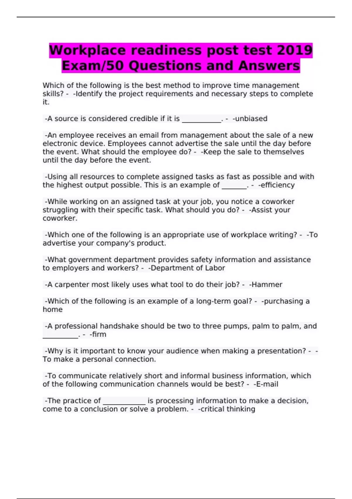 Workplace readiness post test 2019 Exam/50 Questions and Answers