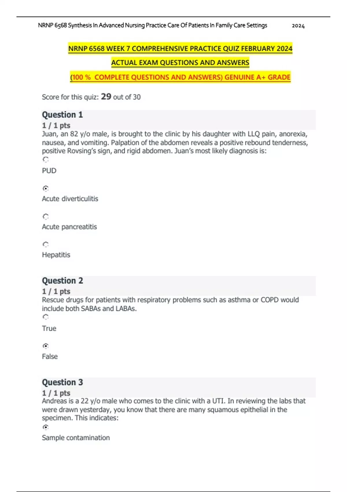 NRNP 6568 WEEK 7 COMPREHENSIVE PRACTICE QUIZ FEBRUARY 2024 ACTUAL EXAM QUESTIONS AND ANSWERS (100 % COMPLETE QUESTIONS AND ANSWERS) GENUINE A+ GRADE Score for this quiz: 29 out of 30 Juan, an 82 y/o male, is brought to the clinic by his daughter with LLQ pain, anorexia, nausea, and vomiting. Palpation of the abdomen reveals a positive rebound tenderness, positive Rovsing’s sign, and rigid abdomen. Juan’s most likely diagnosis is: PUD Acute diverticulitis Acute pancreatitis Hepatitis Rescue drugs for patients with respiratory problems such as asthma or COPD would include both SABAs and LABAs. True False Andreas is a 22 y/o male who comes to the clinic with a UTI. In reviewing the labs that were drawn yesterday, you know that there are many squamous epithelial in the specimen. This indicates: Sample contamination Pyelonephritis Bladder cancer None of the above Martin is a 73 y/o male who has a 50 pack/year history of smoking and comes to the clinic for his annual physical. As you are leading him back to the exam room you note that he has dyspnea with minimal cough, a barrel chest, and appears to have lost weight since his last visit. Your physical exam confirms a 20 lb. weight loss and more noticeable pursed lip breathing. Given Martin’s condition, the first line treatment would be all the following except: Albuterol Salmeterol Levalbuterol Metaproterenol Oral contraceptives can be started anytime in the menstrual cycle. True False Antipsychotics lead to an increased risk of metabolic syndrome. True False Artie, a 36 y/o male, comes to the clinic with chief complaint of: intermittent flank one side flank pain. The pain is an 8 on a scale of 1–10, with 10 being the worst pain he has ever felt. He states the pain lasts from 20–60 minutes and that he must either stand or walk when the pain hits. He also notes that he has blood in his urine. Treatment of Artie’s condition would involve avoiding which of the following foods: A. Rhubarb B. Spinach C. Beets D. Chocolate E. All of the above F. All of the above except D In treating patients for depression, the first line pharmacological treatment would be: Monoamine oxidase inhibitors (MAOIs) Benzodiazepines Selective serotonin reuptake inhibitors (SSRIs) Tricyclic antidepressants (TCAs) The most common drug trigger for Stevens-Johnson Syndrome include all the following except: ASA NSAIDS Anticonvulsants Allopurinol Jon, a 63 y/o male, comes to the clinic with the following presentation. He reports a