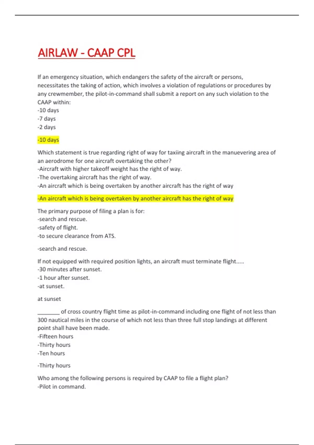 Which statement is true regarding right of way for taxiing aircraft in the manuevering area of an aerodrome for one aircraft overtaking the other? -Aircraft with higher takeoff weight has the right of way. -The overtaking aircraft has the right of way. -An aircraft which is being overtaken by another aircraft has the right of way -An aircraft which is being overtaken by another aircraft has the right of way The primary purpose of filing a plan is for: -search and rescue. -safety of flight. -to secure clearance from ATS. -search and rescue. If not equipped with required position lights, an aircraft must terminate flight..... -30 minutes after sunset. -1 hour after sunset. -at sunset. at sunset