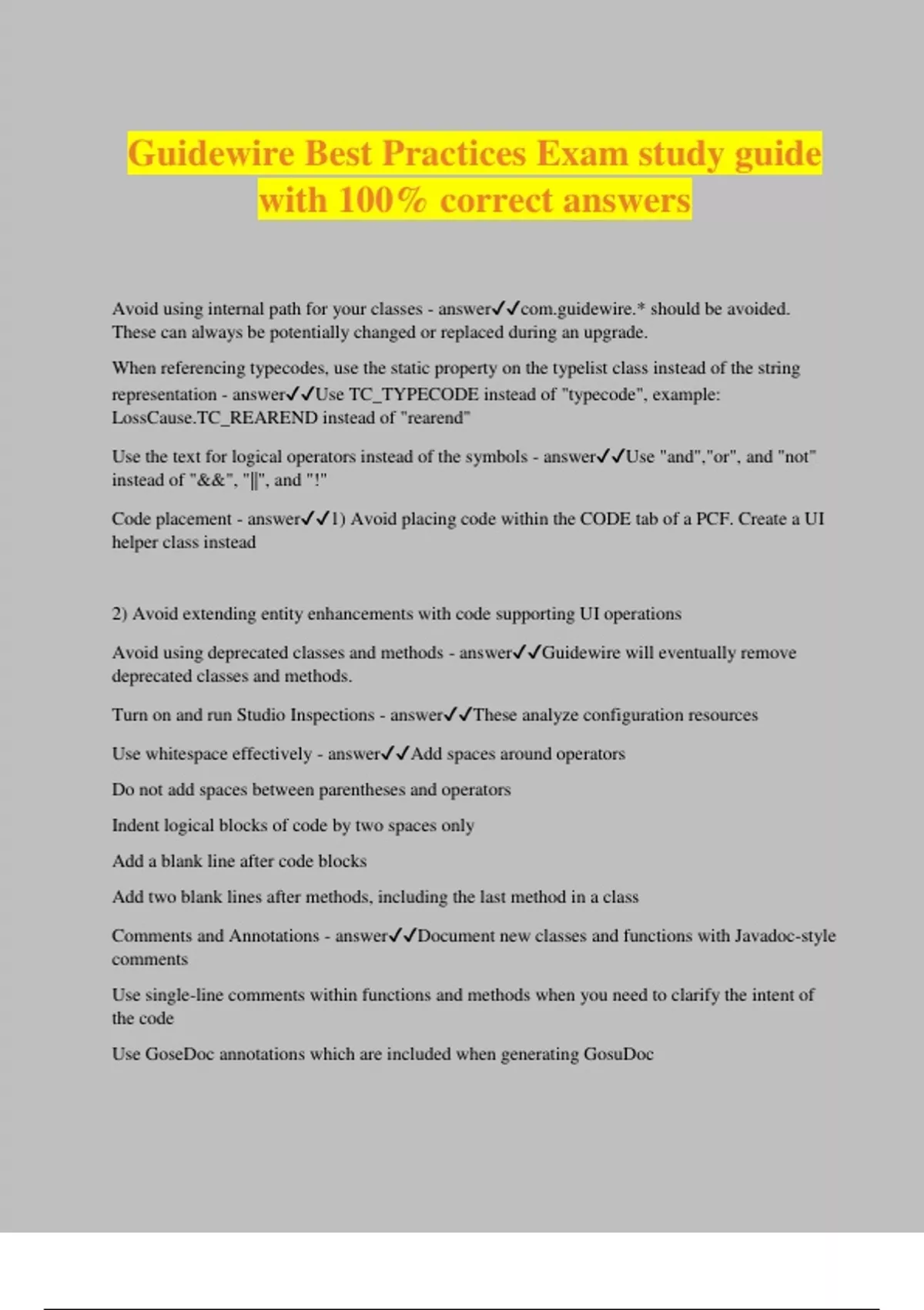 Guidewire Best Practices Exam study guide with 100% correct answers Avoid using internal path for your classes - answerwire.* should be avoided. These can always be potentially changed or replaced during an upgrade. When referencing typecodes, use the static property on the typelist class instead of the string representation - answerUse TC_TYPECODE instead of "typecode", example: LossCause.TC_REAREND instead of "rearend" Use the text for logical operators instead of the symbols - answerUse "and","or", and "not" instead of "&&", "||", and "!" Code placement - answer1) Avoid placing code within the CODE tab of a PCF. Create a UI helper class instead 2) Avoid extending entity enhancements with code supporting UI operations Avoid using deprecated classes and methods - answerGuidewire will eventually remove deprecated classes and methods. Turn on and run Studio Inspections - answerThese analyze configuration resources Use whitespace effectively - answerAdd spaces around operators Do not add spaces between parentheses and operators Indent logical blocks of code by two spaces only Add a blank line after code blocks Add two blank lines after methods, including the last method in a class Comments and Annotations - answerDocument new classes and functions with Javadoc-style comments Use single-line comments within functions and methods when you need to clarify the intent of the code Use GoseDoc annotations which are included when generating GosuDoc "Upgrade-Safe" naming conventions: Add the suffix _Ext to - answerColumns added to existing entities Typecodes added to existing typelists The name of custom entities The name of custom typelists New PCF files Script parameters Package naming conventions - answerUse the format re Customer - company name abbreviation Application- InsuranceSuite application code (pc, bc, cc, suite) Feature Category - major feature (delinquency, configuration, integration) Feature - feature (rating, catastrophe, authentication) Example: ntication Class naming conventions - answerUse UpperCamelCase Do not add _Ext to classes within customer package spaces Function naming conventions - answerUse lowerCamelCase Use a verb that describes that the function is doing i.e. verifyAddress Do not add _Ext suffix to private functions or enhancements in customer package spaces Variable naming conventions - answerMember variable names use lowerCamelCase with a leading underscore i.e. _pluginCallbackH