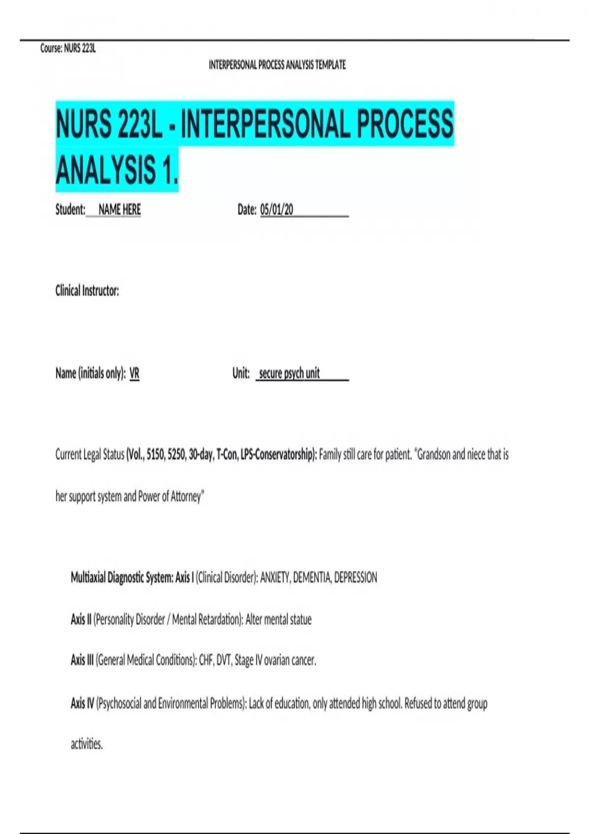 NURS 223L - INTERPERSONAL PROCESS ANALYSIS 1. Student: NAME HERE Date: 05/01/20 Clinical Instructor: Name (initials only): VR Unit: secure psych unit Current Legal Status (Vol., 5150, 5250, 30-day, T-Con, LPS-Conservatorship): Family still care for patient. “Grandson and niece that is her support system and Power of Attorney” Multiaxial Diagnostic System: Axis I (Clinical Disorder): ANXIETY, DEMENTIA, DEPRESSION Axis II (Personality Disorder / Mental Retardation): Alter mental statue Axis III (General Medical Conditions): CHF, DVT, Stage IV ovarian cancer. Axis IV (Psychosocial and Environmental Problems): Lack of education, only attended high school. Refused to attend group activities. Axis V (Global Assessment of Functioning Scale): Level 31. Pt possesses some danger of hurting self or others. 1. Description of the patient: Age? Sex? Ethnicity? Marital Status? What precipitated hospitalization? Number of days in the hospital? Mental Status, etc. Client is 57 years old Caucasian female, divorced some couple of years ago, but has a grandson and a niece, who is her support and also her power of Attorney. Patient was in the memory care about two years ago. Patients wanders to other patients’ rooms and slap them in the face, go around stealing medication cups. Before her admission to the hospital, she was admitted to the hospice, due her terminal illness, that have metastasized to her brain causing her alter mental statue. Patient was admitted to Millwood hospital for an attempted elopement from her memory care unit. Patient was admitted on the 04/24/20, and has been in the hospital for one week now. She is alert and oriented x 1. Patient has a wander guard on her ankle so she does not attempt to elope. Patient has been uncooperative with care, has a poor judgment, ambulates independently, she has a low tone and soft speech, and thinks that everyone is trying to hold her hostage. When asked the reason for admission, patient was tearful without eye contact states “I don’t know”. Pt is so anxious that she couldn’t sit down during the interaction process, she was just pacing all forth and back the room, but could still answer some questions.