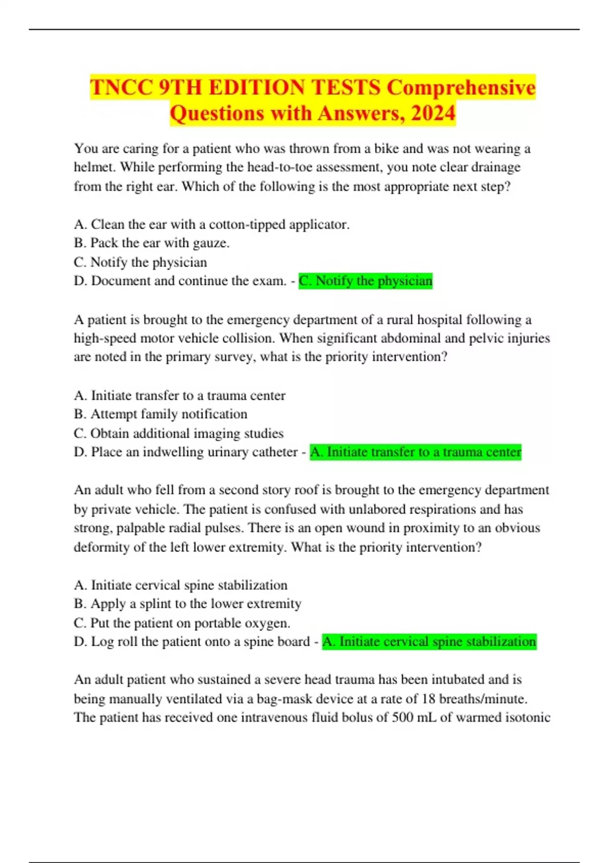 TNCC 9TH EDITION TESTS Comprehensive Questions with Answers, 2024