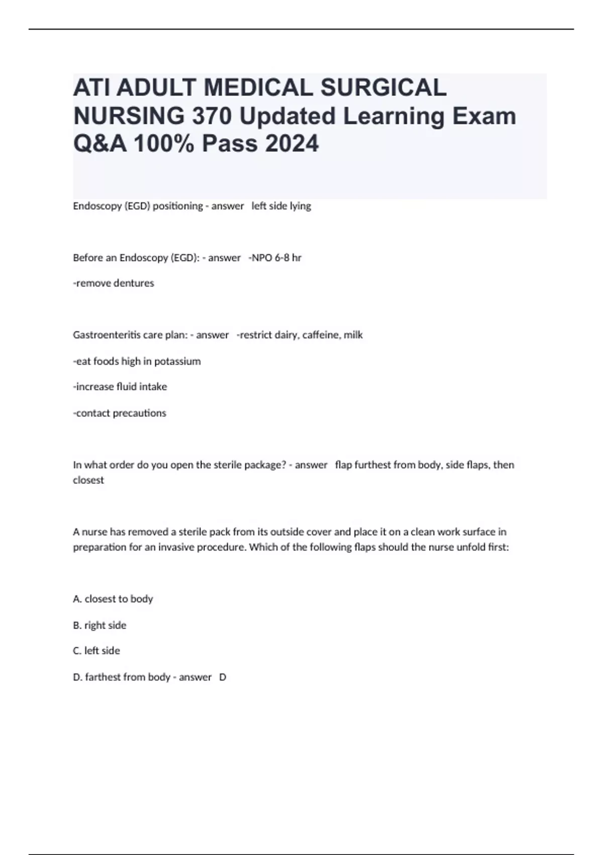 In what order do you open the sterile package? - answer flap furthest from body, side flaps, then