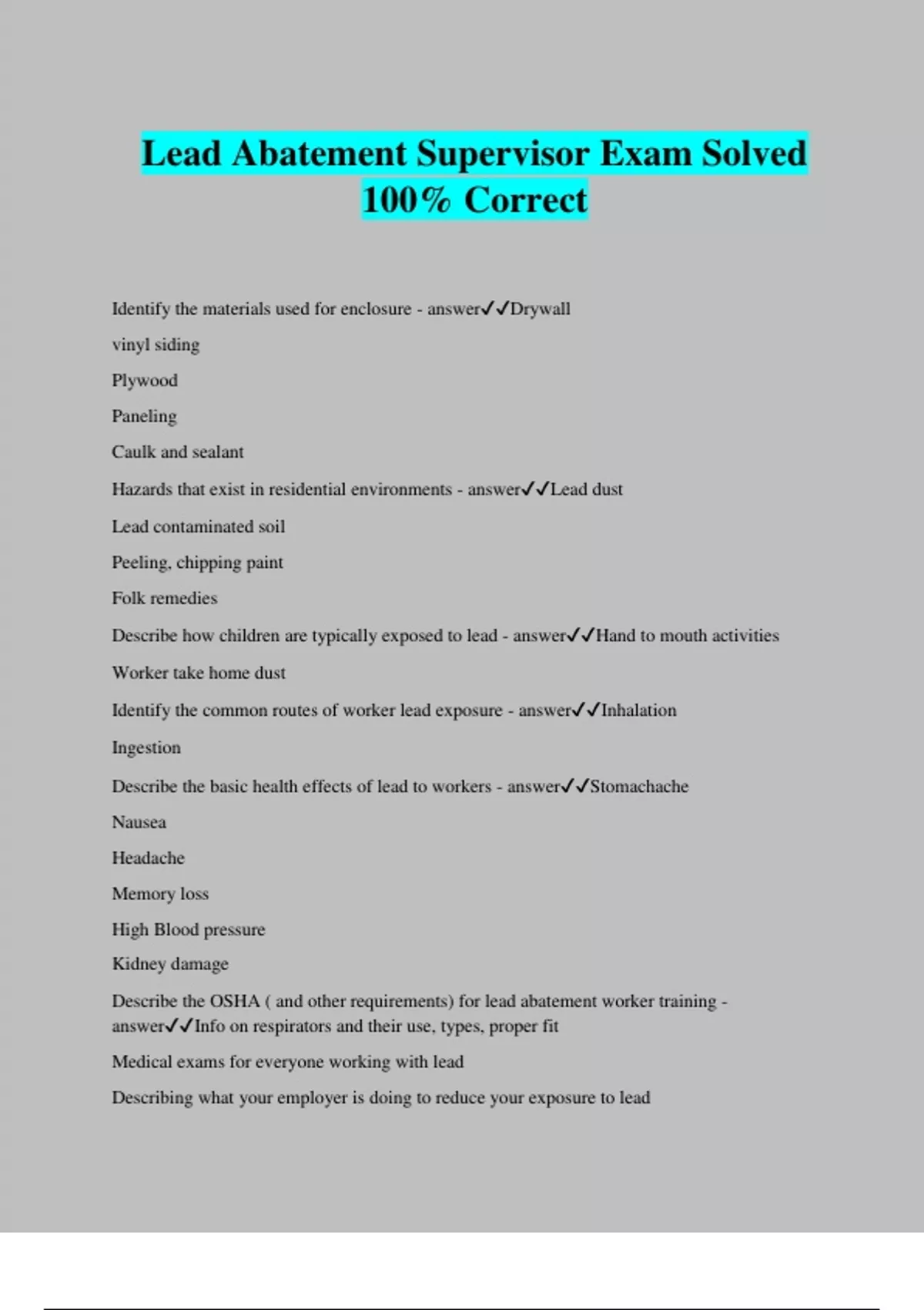 Lead Abatement Supervisor Exam Solved 100% Correct