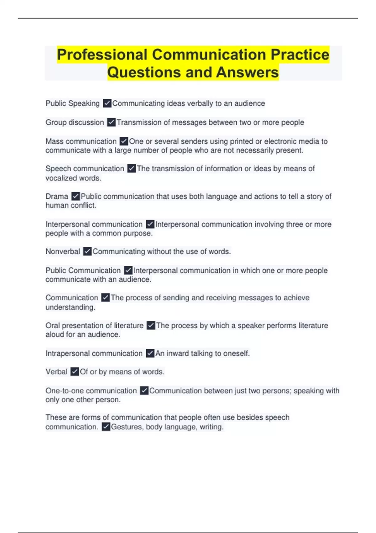 Public Speaking Communicating ideas verbally to an audience Group discussion Transmission of messages between two or more people Mass communication One or several senders using printed or electronic media to communicate with a large number of people who are not necessarily present. Speech communication The transmission of information or ideas by means of vocalized words. Drama Public communication that uses both language and actions to tell a story of human conflict. Interpersonal communication Interpersonal communication involving three or more people with a common purpose. Nonverbal Communicating without the use of words. Public Communication Interpersonal communication in which one or more people communicate with an audience