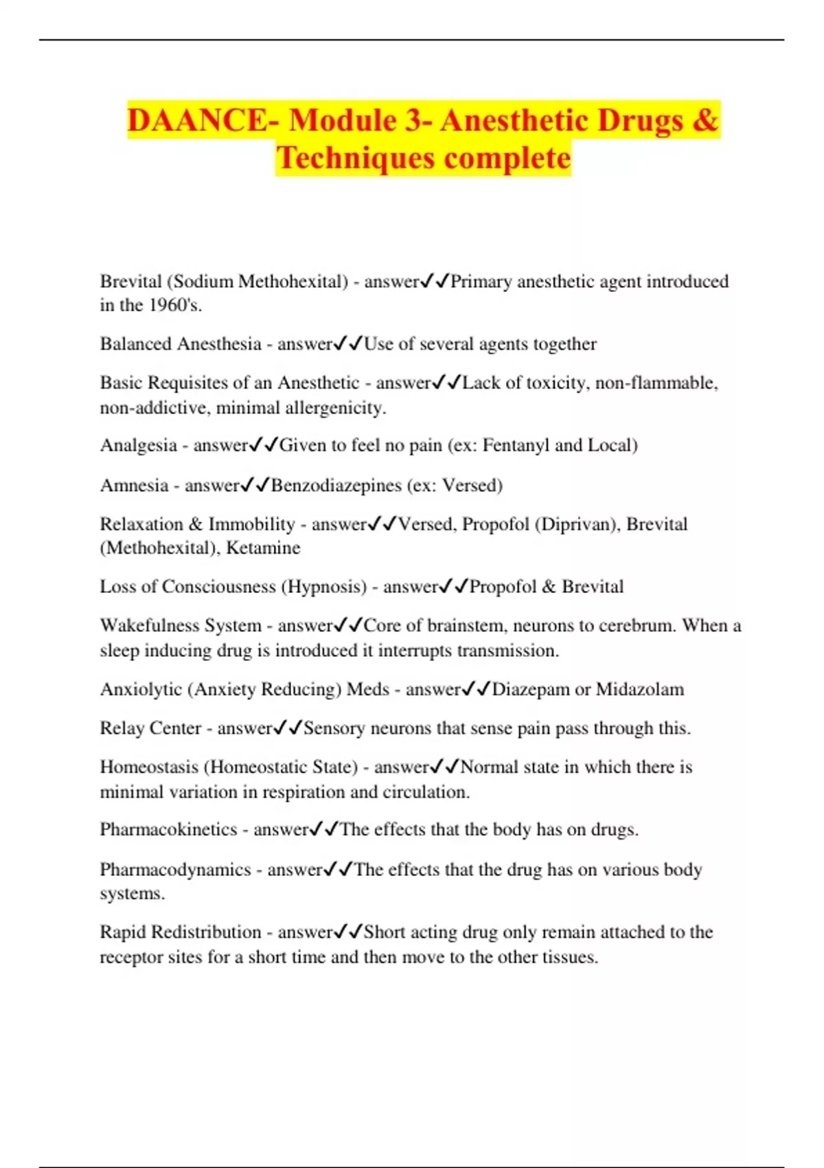 DAANCE- Module 3- Anesthetic Drugs & Techniques complete Brevital (Sodium Methohexital) - answerPrimary anesthetic agent introduced in the 1960's. Balanced Anesthesia - answerUse of several agents together Basic Requisites of an Anesthetic - answerLack of toxicity, non-flammable, non-addictive, minimal allergenicity. Analgesia - answerGiven to feel no pain (ex: Fentanyl and Local) Amnesia - answerBenzodiazepines (ex: Versed) Relaxation & Immobility - answerVersed, Propofol (Diprivan), Brevital (Methohexital), Ketamine Loss of Consciousness (Hypnosis) - answerPropofol & Brevital Wakefulness System - answerCore of brainstem, neurons to cerebrum. When a sleep inducing drug is introduced it interrupts transmission. Anxiolytic (Anxiety Reducing) Meds - answerDiazepam or Midazolam Relay Center - answerSensory neurons that sense pain pass through this. Homeostasis (Homeostatic State) - answerNormal state in which there is minimal variation in respiration and circulation. Pharmacokinetics - answerThe effects that the body has on drugs. Pharmacodynamics - answerThe effects that the drug has on various body systems. Rapid Redistribution - answerShort acting drug only remain attached to the receptor sites for a short time and then move to the other tissues.