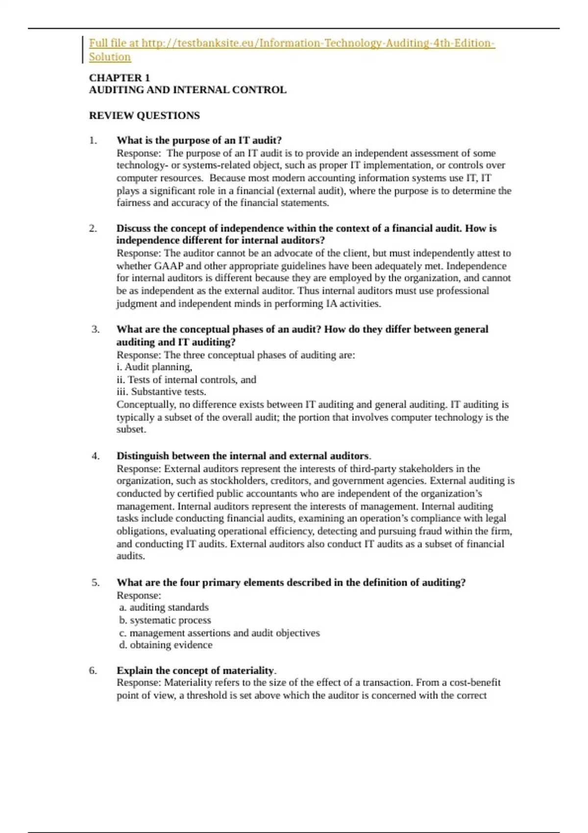 1. What is the purpose of an IT audit? Response: The purpose of an IT audit is to provide an independent assessment of some technology- or systems-related object, such as proper IT implementation, or controls over computer resources. Because most modern accounting information systems use IT, IT plays a significant role in a financial (external audit), where the purpose is to determine the fairness and accuracy of the financial statements. 2. Discuss the concept of independence within the context of a financial audit. How is independence different for internal auditors? Response: The auditor cannot be an advocate of the client, but must independently attest to whether GAAP and other appropriate guidelines have been adequately met. Independence for internal auditors is different because they are employed by the organization, and cannot be as independent as the external auditor. Thus internal auditors must use professional judgment and independent minds in performing IA activities. 3. What are the conceptual phases of an audit? How do they differ between general auditing and IT auditing? Response: The three conceptual phases of auditing are: i. Audit planning, ii. Tests of internal controls, and iii. Substantive tests. Conceptually, no difference exists between IT auditing and general auditing. IT auditing is typically a subset of the overall audit; the portion that involves computer technology is the subset. 4. Distinguish between the internal and external auditors. Response: External auditors represent the interests of third-party stakeholders in the organization, such as stockholders, creditors, and government agencies. External auditing is conducted by certified public accountants who are independent of the organization’s management. Internal auditors represent the interests of management. Internal auditing tasks include conducting financial audits, examining an operation’s compliance with legal obligations, evaluating operational efficiency, detecting and pursuing fraud within the firm, and conducting IT audits. External auditors also conduct IT audits as a subset of financial audits.