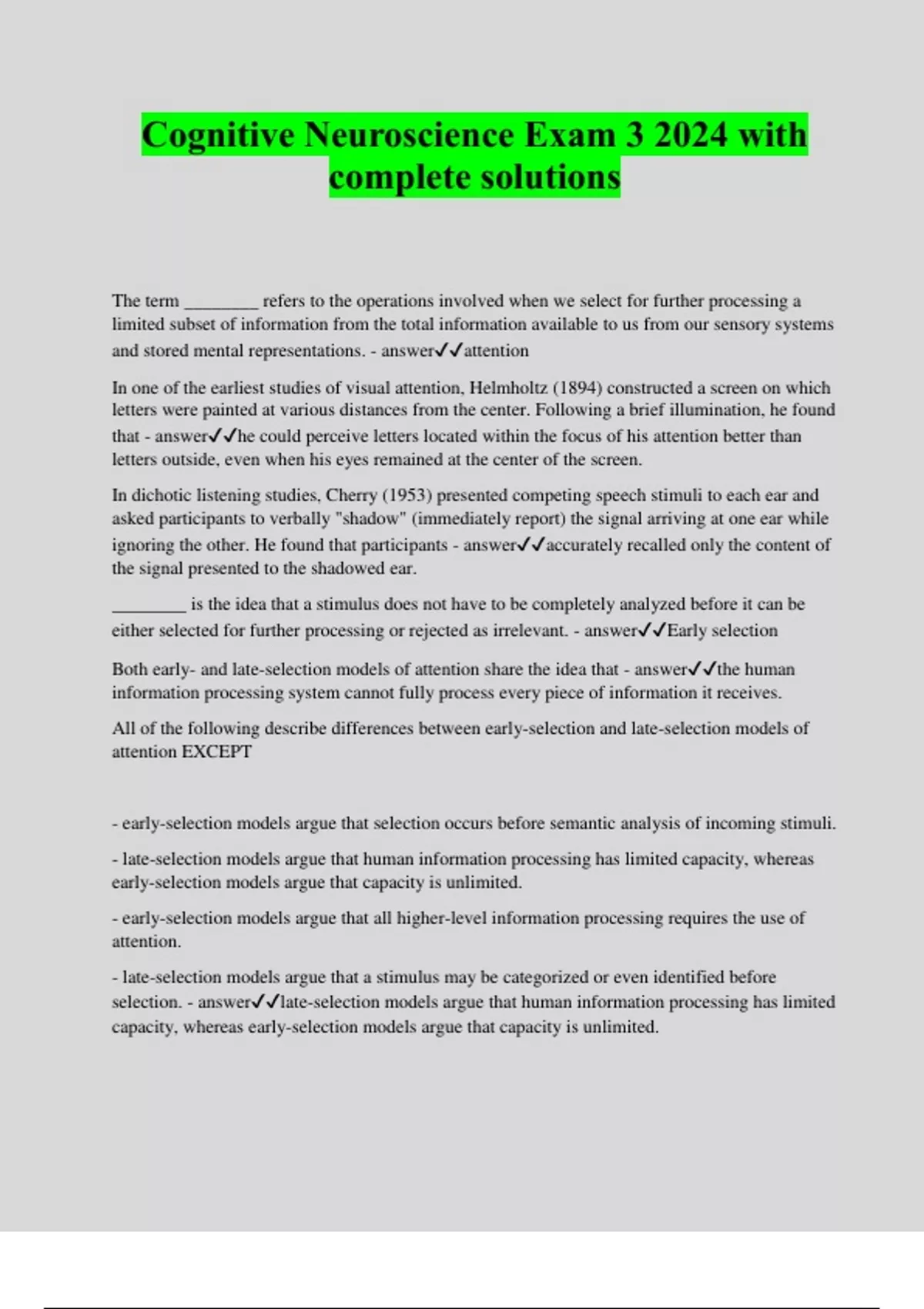 Cognitive Neuroscience Exam 3 2024 with complete solutions The term ________ refers to the operations involved when we select for further processing a limited subset of information from the total information available to us from our sensory systems and stored mental representations. - answerattention In one of the earliest studies of visual attention, Helmholtz (1894) constructed a screen on which letters were painted at various distances from the center. Following a brief illumination, he found that - answerhe could perceive letters located within the focus of his attention better than letters outside, even when his eyes remained at the center of the screen. In dichotic listening studies, Cherry (1953) presented competing speech stimuli to each ear and asked participants to verbally "shadow" (immediately report) the signal arriving at one ear while ignoring the other. He found that participants - answeraccurately recalled only the content of the signal presented to the shadowed ear. ________ is the idea that a stimulus does not have to be completely analyzed before it can be either selected for further processing or rejected as irrelevant. - answerEarly selection Both early- and late-selection models of attention share the idea that - answerthe human information processing system cannot fully process every piece of information it receives. All of the following describe differences between early-selection and late-selection models of attention EXCEPT - early-selection models argue that selection occurs before semantic analysis of incoming stimuli. - late-selection models argue that human information processing has limited capacity, whereas early-selection models argue that capacity is unlimited. - early-selection models argue that all higher-level information processing requires the use of attention. - late-selection models argue that a stimulus may be categorized or even identified before selection. - answerlate-selection models argue that human information processing has limited capacity, whereas early-selection models argue that capacity is unlimited. In attention experiments, cues that correctly predict the location of the target are called ________, whereas cues that predict other locations are called ________. - answervalid / invalid Which of the following phenomena is the most consciously mediated? - Inhibition of return - Reflexive attention - Exogenous cuing - Endogenous cuing - answerEndogenous cuing The process of directing one's attention to a specific external stimulus is called - answerorienting. One finding demonstrated by the Posner spatial cuing task (1980) is that - answerthe focus of attention can be moved separately from eye fixation. The Posner spatial cuing task (1980) showed that cuing participants to the location of an upcoming target - answerdecreased reaction time to detect the target. The observation that participants are actually slower to detect targets that appear at recent previously attended locations is called - answerinhibition of return You are looking for a friend who is supposed to meet you in a crowded lecture hall. You know that she is wearing a bright purple sweater and glasses. Which kind of visual search best describes this situation? - answerConjunction search Techniques such as EEG are particularly well suited to studies of attention. However, one difficulty in using these techniques is that - answerone must also use a structural neuroimaging technique to isolate the source of attentional activation to a specific brain structure. Hillyard and colleagues (1973) recorded event-related potentials (ERP) from participants while they performed a dichotic listening task. When comparing the ERPs collected when participants attended to a given signal to when they ignored this signal, the researchers found that auditory ERPs - answerwere larger for attended versus unattended signals The P1 ERP is associated most closely with the - answerdirection of attention to the spatial location of a visually presented object. Studies of attention employing the P1 waveform and the N1 waveform suggest that - answerboth vision and audition involve an early-selection m