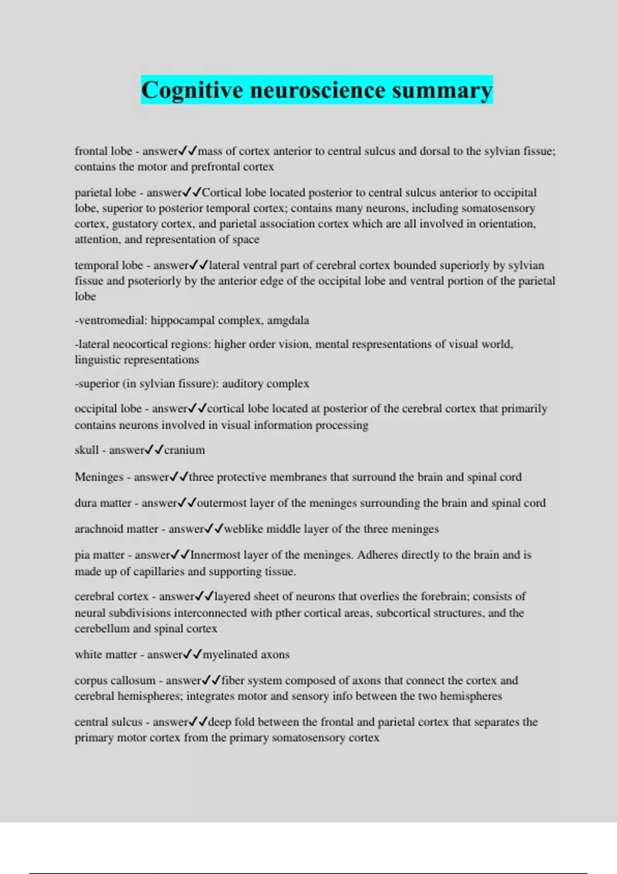 Cognitive neuroscience summary frontal lobe - answermass of cortex anterior to central sulcus and dorsal to the sylvian fissue; contains the motor and prefrontal cortex parietal lobe - answerCortical lobe located posterior to central sulcus anterior to occipital lobe, superior to posterior temporal cortex; contains many neurons, including somatosensory cortex, gustatory cortex, and parietal association cortex which are all involved in orientation, attention, and representation of space temporal lobe - answerlateral ventral part of cerebral cortex bounded superiorly by sylvian fissue and psoteriorly by the anterior edge of the occipital lobe and ventral portion of the parietal lobe -ventromedial: hippocampal complex, amgdala -lateral neocortical regions: higher order vision, mental respresentations of visual world, linguistic representations -superior (in sylvian fissure): auditory complex occipital lobe - answercortical lobe located at posterior of the cerebral cortex that primarily contains neurons involved in visual information processing skull - answercranium Meninges - answerthree protective membranes that surround the brain and spinal cord dura matter - answeroutermost layer of the meninges surrounding the brain and spinal cord arachnoid matter - answerweblike middle layer of the three meninges pia matter - answerInnermost layer of the meninges. Adheres directly to the brain and is made up of capillaries and supporting tissue. cerebral cortex - answerlayered sheet of neurons that overlies the forebrain; consists of neural subdivisions interconnected with pther cortical areas, subcortical structures, and the cerebellum and spinal cortex white matter - answermyelinated axons corpus callosum - answerfiber system composed of axons that connect the cortex and cerebral hemispheres; integrates motor and sensory info between the two hemispheres central sulcus - answerdeep fold between the frontal and parietal cortex that separates the primary motor cortex from the primary somatosensory cortex