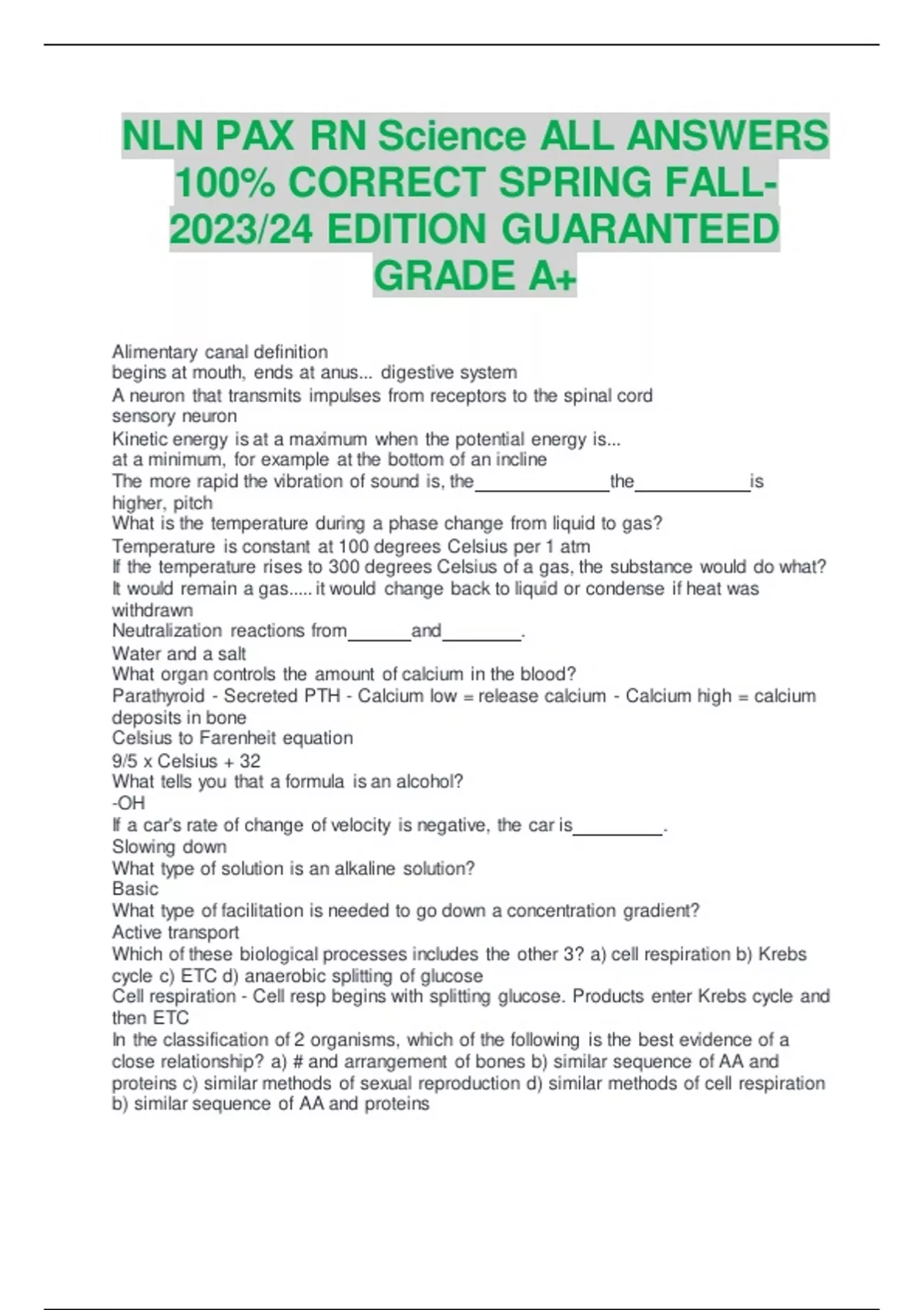 NLN PAX RN Science ALL ANSWERS 100