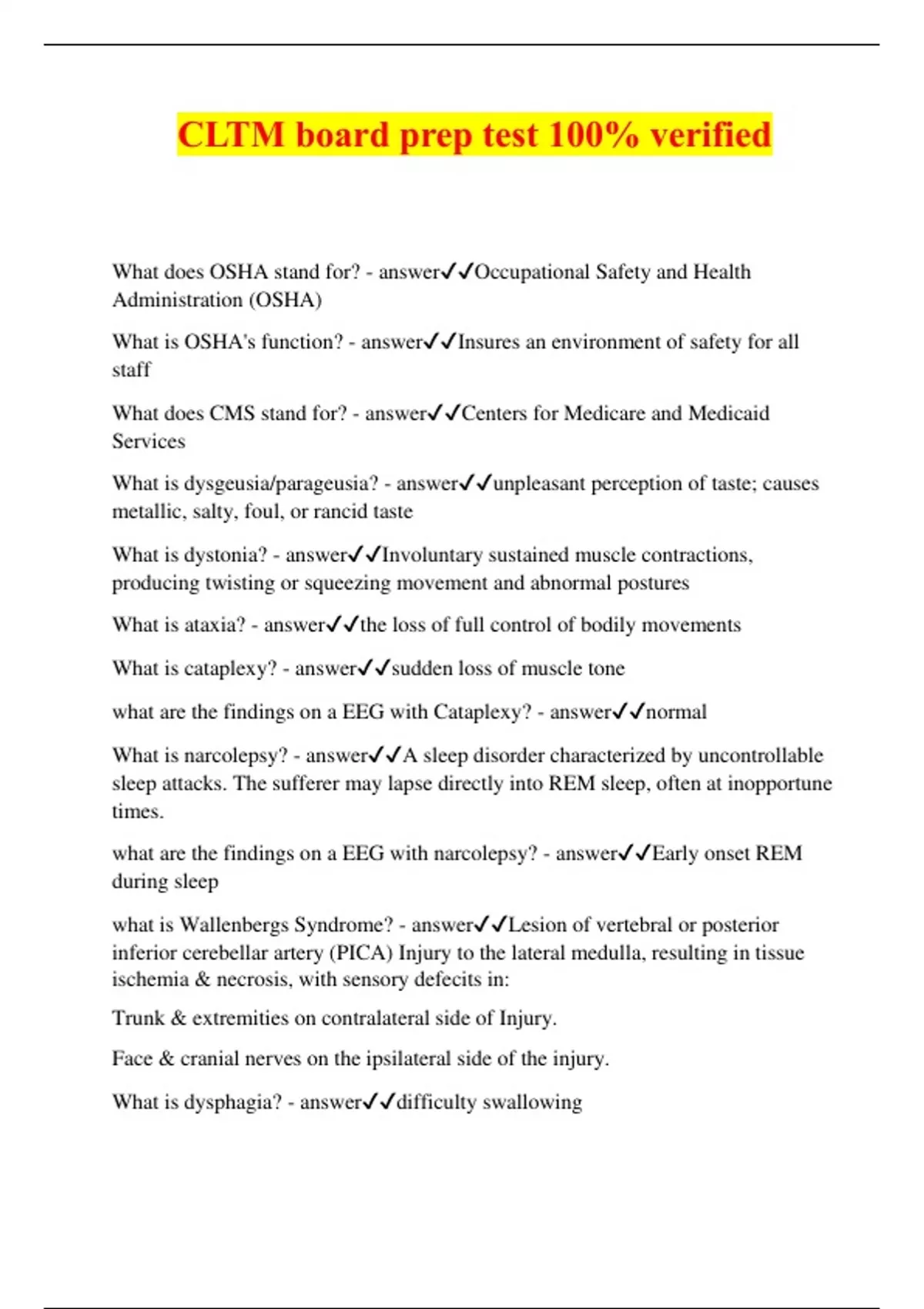 CLTM board prep test 100% verified What does OSHA stand for? - answerOccupational Safety and Health Administration (OSHA) What is OSHA's function? - answerInsures an environment of safety for all staff What does CMS stand for? - answerCenters for Medicare and Medicaid Services What is dysgeusia/parageusia? - answerunpleasant perception of taste; causes metallic, salty, foul, or rancid taste What is dystonia? - answerInvoluntary sustained muscle contractions, producing twisting or squeezing movement and abnormal postures What is ataxia? - answerthe loss of full control of bodily movements What is cataplexy? - answersudden loss of muscle tone what are the findings on a EEG with Cataplexy? - answernormal What is narcolepsy? - answerA sleep disorder characterized by uncontrollable sleep attacks. The sufferer may lapse directly into REM sleep, often at inopportune times. what are the findings on a EEG with narcolepsy? - answerEarly onset REM during sleep what is Wallenbergs Syndrome? - answerLesion of vertebral or posterior inferior cerebellar artery (PICA) Injury to the lateral medulla, resulting in tissue ischemia & necrosis, with sensory defecits in: Trunk & extremities on contralateral side of Injury. Face & cranial nerves on the ipsilateral side of the injury. What is dysphagia? - answerdifficulty swallowi