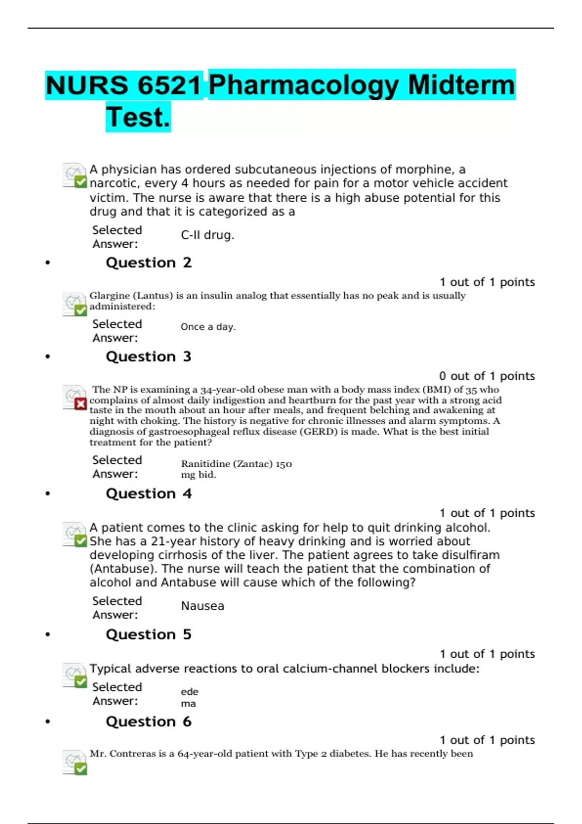 NURS 6521 Pharmacology Midterm Test. A physician has ordered subcutaneous injections of morphine, a narcotic, every 4 hours as needed for pain for a motor vehicle accident victim. The nurse is aware that there is a high abuse potential for this drug and that it is categorized as a Selected Answer: C-II drug. • Question 2 1 out of 1 points Glargine (Lantus) is an insulin analog that essentially has no peak and is usually administered: Selected Answer: Once a day. • Question 3 0 out of 1 points The NP is examining a 34-year-old obese man with a body mass index (BMI) of 35 who complains of almost daily indigestion and heartburn for the past year with a strong acid taste in the mouth about an hour after meals, and frequent belching and awakening at night with choking. The history is negative for chronic illnesses and alarm symptoms. A diagnosis of gastroesophageal reflux disease (GERD) is made. What is the best initial treatment for the patient? Selected Answer: Ranitidine (Zantac) 150 mg bid. • Question 4 1 out of 1 points A patient comes to the clinic asking for help to quit drinking alcohol. She has a 21-year history of heavy drinking and is worried about developing cirrhosis of the liver. The patient agrees to take disulfiram (Antabuse). The nurse will teach the patient that the combination of alcohol and Antabuse will cause which of the following? Selected Answer: Nausea • Question 5 1 out of 1 points Typical adverse reactions to oral calcium-channel blockers include: Selected Answer: ede ma • Question 6 1 out of 1 points Mr. Contreras is a 64-year-old patient with Type 2 diabetes. He has recently been diagnosed with hypertension. Which antihypertensive drug is the recommended choice to treat hypertension in patients with diabetes? Selected Answer: ACE Inhibitor • Question 7 1 out of 1 points Mr. Johnson is an 80 year old male who is on Digoxin therapy. The Nurse Practitioner knows they should monitor the older adult patient for which of the most common adverse reactions of digoxin? Selected Answer: confusi on • Question 8 1 out of 1 points /Jillian is a Nurse Practitioner. She recognizes that Nurse Practitioner prescriptive authority Is regulated by: Selected Answer: The state board of nursing for each state • Question 9 1 out of 1 points A Nurse Practitioner is conducting an assessment of a patient who has recently had several changes made to her drug regimen. What assessment question most directly addresses the safety implications of the patient's drug regimen? Selected Answer: "Do you take any herbal supplements or alternative medications?" • Question 10 0 out of 1 points A patient has been started on a treatment regimen that includes levothyroxine. Select the dosage regimen that is most appropriate for a mean replacement dosage. The patient has been started on a treatment regimen that includes levothyroxine. Select the dosage regimen that is most appropriate for a mean replacement dosage. Selected Answer: 1.2 mcg/kg of body weight per day • Question 11 1 out of 1 points A Nurse Practitioner is caring for a patient who is diabetic and has been diagnosed with hypertension. An angiotensin-converting enzyme inhibitor, captopril, has been prescribed for her. Which of the following should the Nurse Practitioner assess before beginning drug therapy? Selected Answer: Serum potassium levels • Question 12 1 out of 1 points A 76-year-old woman has a complex medical history that includes emphysema, osteoporosis, malnutrition, and hypothyroidism. Recently, the woman fell outside her home as a result of weakness and suffered a fracture to her femoral head. The woman's subsequent hip-replacement surgery has been scheduled and the care team recognizes that the use of isoflurane will be most significantly influenced by Selected Answer: her history of emphysema. • Question 13 A common side effect of metformin (Glucophage) therapy is: 1 out of 1 points Selected Answer: diarrh ea • Question 14 The side effects of antihistamines are mostly due to their: 0 out of 1 points Selected Answer: sedating effects • Question 15 The APRN's ability to prescribe controlled substances is regulated by: 0 out of 1 points Selected DE Answers: A • Question 16 1 out of 1 points Which type of antihistamines are used to inhibit the secretion of gastric acid in patients with gastrointestinal disorders? Selected H2 Answer: • Question 17 The recommended range for maintaining serum theophylline levels is: 1 out of 1 points Selected Answer: 10 to 20 μg/mL. • Question 18 1 out of 1 points The anticoagulant drug that acts as a vitamin K antagonist is: Selected Answer: couma din • Question 19 0 out of 1 points Which of the following is a potential adverse side effect of autonomic- anticholinergic agents? Selected Answer: Reduced GI motility • Question 20 0 out of 1 points The first drugs typically used to treat the symptoms of an allergic reaction or allergic rhinitis are: Selected Answer: intranasal H1 antihistamines. • Question 21 1 out of 1 points The point in time on the drug concentration curve that indicates the first sign of a therapeutic effect is the Selected Answer: onset of action • Question 22 1 out of 1 points Mr. Lastinger was prescribed warfarin sodium (Coumadin). You advise him to avoid eating large amounts of leafy green vegetables because: Selected Answer: The high vitamin K levels will decrease the INR • Question 23 Some first-generation antihistamines are used: 1 out of 1 points Selected Answer: to prevent motion sickness • Question 24 1 out of 1 points All of the following agents are used to control the inflammatory changes seen in the lungs of asthmatics except: Selected Answer:
