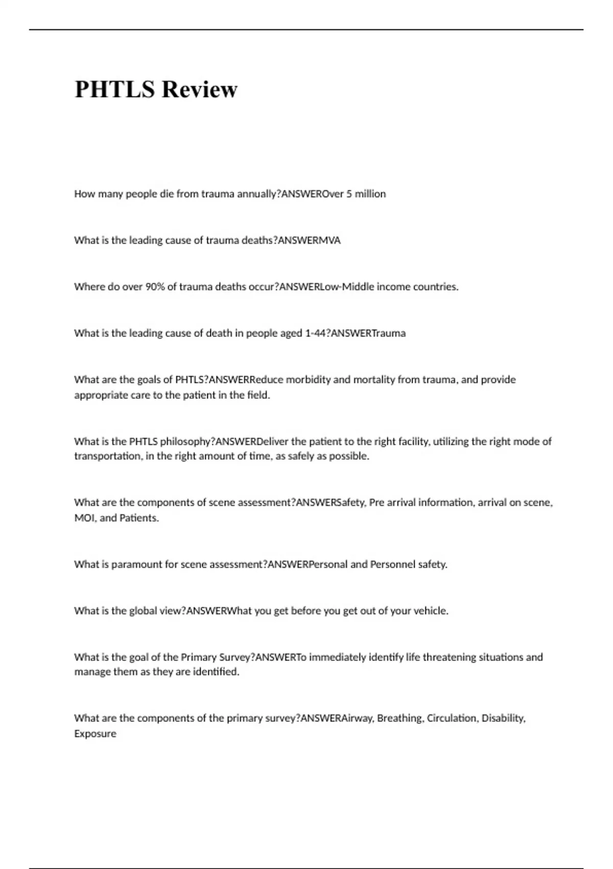 PHTLS Review Questions and Answers 2024 Latest Edition