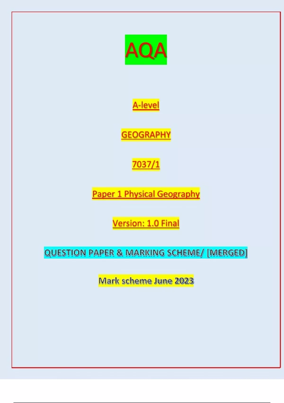 AQA A-level GEOGRAPHY 7037/1 Paper 1 Physical Geography Version: 1.0 Final A-level GEOGRAPHY Paper 1 Physical GeographyQUESTION PAPER & MARKING SCHEME/ [MERGED] Mark scheme June 2023