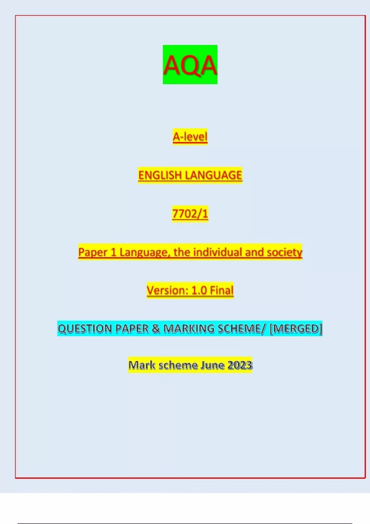 AQA A-level ENGLISH LANGUAGE 7702/1 Paper 1 Language, the individual and society Version: 1.0 Final IB/G/Jun23/E8 7702/1 Thursday 25 May 2023 Morning Time allowed: 2 hours 30 minutes Materials For this paper you must have: • an AQA 12-page answer book • the Insert for Section A (enclosed). Instructions • Use black ink or black ball-point pen. • Write the information required on the front of your answer book. The Paper Reference is 7702/1. • There are two sections: – Section A: Textual variations and representations – Section B: Children’s language development. • Answer all questions from Section A. • Answer either Question 4 or Question 5 from Section B. • Do all rough work in your answer book. Cross through any work you do not want to be marked. Information • The maximum mark for this paper is 100. • The marks for questions are shown in brackets. • There are 25 marks for Question 1, 25 marks for Question 2 and 20 marks for Question 3. There are 30 marks for either Question 4 or Question 5. • You will be marked on your ability to: – use good English – organise information clearly – use specialist vocabulary where appropriate. • A set of phonemic symbols can be found on the back of this paper, for reference. Advice • It is recommended that you use: – 30 minutes reading and preparing the texts – 30 minutes writing your Question 1 answer – 30 minutes writing your Question 2 answer – 20 minutes writing your Question 3 answer – 40 minutes writing your Section B answer. A-level ENGLISH LANGUAGE Paper 1 Language, the individual and society 2 IB/G/Jun23/7702/1 There are no questions printed on this page 3 IB/G/Jun23/7702/1 Turn over ► Section A Textual variations and representations Answer all questions from this section. Text A and Text B are on the Insert. Text A is an online article from BBC News, published in March 2019. Text B is a magazine article from The Bystander, published in April 1928. 0 1 Analyse how Text A uses language to create meanings and representations. [25 marks] 0 2 Analyse how Text B uses language to create meanings and representations. [25 marks] 0 3 Explore the similarities and differences in the ways that Text A and Text B use language. [20 marks] Turn over for Section B 4 IB/G/Jun23/7702/1 Section B Children’s language development Answer either Question 4 or Question 5 from this section. Either 0 4 ‘Children’s language development depends on their experiences of the world around them.’ Referring to Data Set 1 in detail, and to relevant ideas from language study, evaluate this view of children’s language development. [30 marks] Transcription key: (.) pause of less than a second (2.0) longer pause (number of seconds indicated) bold stressed syllables [italics] contextual information / / indicates a phonemic transcription CAPITALS indicates raised volume simultaneous speech A set of phonemic symbols can be found on the back of the Insert and also on the back of this paper, for reference. Data Set 1 Jo is 4 years old. She is sitting at the kitchen table with her mother, eating her breakfast. She has been given a dried fig to taste for the first time. Mother: what are you eating Jo (.) do you remember what they’re called Jo: Mummy close your eyes Mother: oh okay Jo: OPEN Mother: did you eat some (.) can you talk to me about it 5 Jo: they’re sweet Mother: sweet 5 IB/G/Jun23/7702/1 Turn over ► Jo: Mummy look [pointing at the figs on the table] (.) that one’s getting longer and that one’s getting smaller. Mother: oh very good 10 Jo: not really small ’cause I didn’t eat too much (1.0) Mummy can put your finger (.) can you put your finger in this (1.0) [puts fingertip and tip of thumb together to make a circle shape and lifts hand towards her mother’s face] put your finger in that Mother: inside Jo: yeah [Jo’s mother closes her thumb and fingertip around Jo’s thumb and fingertip so that they are like two connected hoops] 15 Mother: like a (.) like two rings Jo: and then pull (2.0) [Jo pulls her finger and thumb away from her mother’s to break the connected hoops] I winned Mother: yeah [laughs] you winned yeah (1.0) I won 20 Jo: I won (.) you won Mother: well done we both won (.) both winners Jo: is Daddy a winner Mother: yeah Daddy’s a winner Jo: and Nick 25 Mother: Nick’s a winner too Jo: what about Auntie Lynne Mother: yeah everyone’s a winner (.) everyone’s a winner Jo: what about babies Mother: yeah babies are winners (1.0) everyone’s a winner (.) you’ve just got to be kind and gentle and 30 Jo: what (.) what about (.) plants? Mother: that’s a different sort of thing isn’t it (.) plants aren’t sentient they don’t have (.) thoughts in the way that we have thoughts (1.0) plants aren’t human they’re plants Jo: why is 35 Mother: but I think all plants are winners (.) they’re keeping the (.) planet alive aren’t they Jo: Mummy (.) MUMMY Mother: yes Jo: why does bees collect honey from the flowers Mother: why do [laughs] say that again 40 Jo: why does bees collect honey from the flowers Mother: um that’s a good question um that’s what they do (.) bees they do it (1.0) they [laughs] I actually don’t know why they do it [laughs] Jo: that’s why they do it because they love it Mother: because they love it (.) that’s a good answer 45 Jo: and (.) when they (.) when bees die (.) they die Mother: yeah it’s not great when a bee dies (1.0) it’s not good for the planet (.) so we’ve got to protect the bees Jo: yep from monsters Mother: yeah the human monster (2.0) oh hi Nick (1.0) come and have some breakfast 50 Turn over for the next question 6 IB/G/Jun23/7702/1 or 0 5 ‘Being creative is an essential part of learning to write.’ Referring to Data Set 2 in detail, and to relevant ideas from language study, evaluate this view of children’s language development. [30 marks] 7 IB/G/Jun23/7702/1 Data Set 2 Lily is 6 years and 3 months old. She produced this story at s