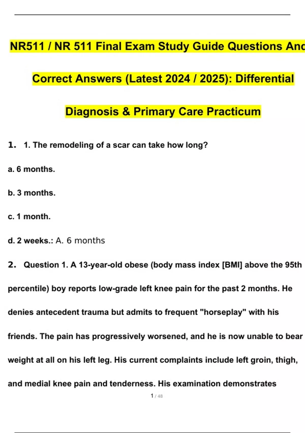 NR511 / NR 511 Final Exam Study Guide Qs & Ans (Latest 2024 / 2025): Differential Diagnosis & Primary Care Practicum (Verified 200+ Qs & Ans)