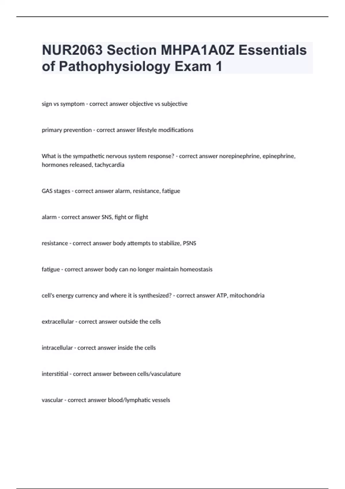 NUR2063 Section MHPA1A0Z Essentials of Pathophysiology Exam 1sign vs symptom - correct answer objective vs subjective primary prevention - correct answer lifestyle modifications What is the sympathetic nervous system response? - correct answer norepinephrine, epinephrine, hormones released, tachycardia GAS stages - correct answer alarm, resistance, fatigue alarm - correct answer SNS, fight or flight resistance - correct answer body attempts to stabilize, PSNS fatigue - correct answer body can no longer maintain homeostasis cell's energy currency and where it is synthesized? - correct answer ATP, mitochondria extracellular - correct answer outside the cells intracellular - correct answer inside the cells interstitial - correct answer between cells/vasculature vascular - correct answer blood/lymphatic vessels
