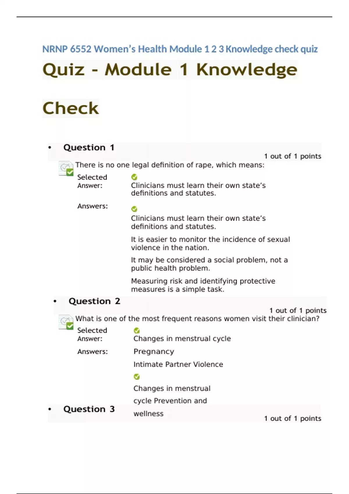 NRNP 6552 Women’s Health Module 1 2 3 Knowledge check quiz