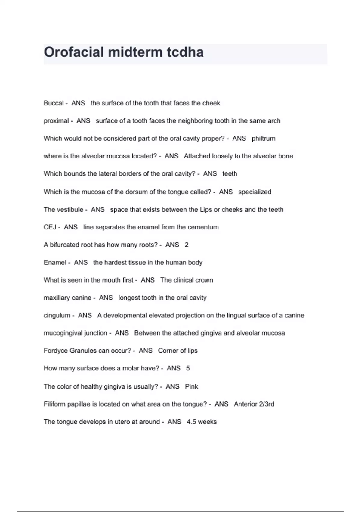 Orofacial midterm tcdha Exam Questions And Answers Buccal - ANS the surface of the tooth that faces the cheek proximal - ANS surface of a tooth faces the neighboring tooth in the same arch Which would not be considered part of the oral cavity proper? - ANS philtrum where is the alveolar mucosa located? - ANS Attached loosely to the alveolar bone Which bounds the lateral borders of the oral cavity? - ANS teeth Which is the mucosa of the dorsum of the tongue called? - ANS specialized The vestibule - ANS space that exists between the Lips or cheeks and the teeth CEJ - ANS line separates the enamel from the cementum A bifurcated root has how many roots? - ANS 2 Enamel - ANS the hardest tissue in the human body What is seen in the mouth first - ANS The clinical crown maxillary canine - ANS longest tooth in the oral cavity cingulum - ANS A developmental elevated projection on the lingual surface of a canine mucogingival junction - ANS Between the attached gingiva and alveolar mucosa Fordyce Granules can occur? - ANS Corner of lips How many surface does a molar have? - ANS 5 The color of healthy gingiva is usually? - ANS Pink Filiform papillae is located on what area on the tongue? - ANS Anterior 2/3rd The tongue develops in utero at around - ANS 4.5 weeks The lining of the oral cavity consists of what type (name) of mucosa? - ANS Stratified squamous epithelial How many nonsuccedaneous teeth are there? - ANS 12 A mixed dentition occurs around the age? - ANS 6 years What is the rudimentary lobe of the maxillary 1st molar called? - ANS The cusp of carabelli The first permanent teeth to erupt in the oral cavity is the? - ANS Mandibular central incisor Developmental grooves/line separate? - ANS the union of developmental lobes When a tooth is developing in the crypt, which part of the tooth develops first? - ANS The crown what week in fetal life do tooth germs begin to develop? - ANS 6 week Secondary dentin occurs? - ANS throughout life coalescence - ANS The fusion of