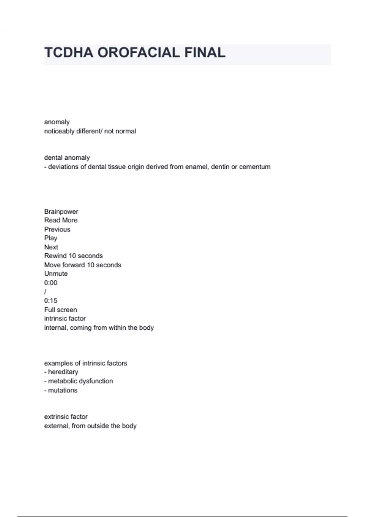 TCDHA OROFACIAL FINAL EXAM QUESTIONS AND ANSWERS anomaly noticeably different/ not normal dental anomaly - deviations of dental tissue origin derived from enamel, dentin or cementum Brainpower Read More Previous Play Next Rewind 10 seconds Move forward 10 seconds Unmute 0:00 / 0:15 Full screen intrinsic factor internal, coming from within the body examples of intrinsic factors - hereditary - metabolic dysfunction - mutations extrinsic factor external, from outside the body - ex. physical/chemical trauma, biologic agents, nutritional deficiencies, stress, habits, environmental conditions examples of extrinsic factors - physical/chemical trauma - biologic agents - nutritional deficiencies - stress, habits - environmental conditions congenital condition occurs at or before birth - if primary teeth are congenitally missing, their permanent will also be absent developmental anomaly condition results during formation and development of the teeth classification of dental anomalies variation in - SIZE (macrodontia, microdontia) - NUMBER of teeth (hyperdontia, anodontia) macrodontia teeth are too LARGE microdontia teeth are too SMALL hyperdontia MULTIPLE/EXTRA teeth - aka supernumerary (too much) supplemental tooth an extra tooth that resembles a regular tooth anodontia too FEW teeth the most common malformed anterior tooth is maxillary lateral incisor (peg shaped) supernumerary teeth are most commonly located - midline - max molar regions - followed by mand premolar region max supernumerary teeth outnumber mand 9 to 1 most common missing permanent teeth - max 3rd molars - max lateral incisors least likely permanent teeth to be missing canines mesiodens - supernumerary teeth in max midline - most common supernumeraries - peg shaped distomolars 4th molars paramolar a supernumerary tooth situated buccally or lingually to a molar - small & rudimentary conical cone shaped supernumerary