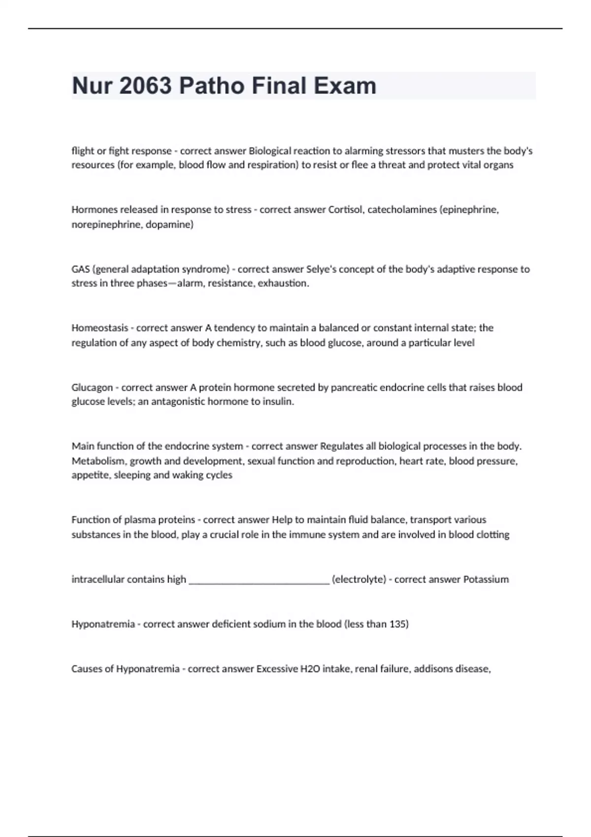 Nur 2063 Patho Final Examflight or fight response - correct answer Biological reaction to alarming stressors that musters the body's resources (for example, blood flow and respiration) to resist or flee a threat and protect vital organs Hormones released in response to stress - correct answer Cortisol, catecholamines (epinephrine, norepinephrine, dopamine) GAS (general adaptation syndrome) - correct answer Selye's concept of the body's adaptive response to stress in three phases—alarm, resistance, exhaustion. Homeostasis - correct answer A tendency to maintain a balanced or constant internal state; the regulation of any aspect of body chemistry, such as blood glucose, around a particular level Glucagon - correct answer A protein hormone secreted by pancreatic endocrine cells that raises blood glucose levels; an antagonistic hormone to insulin. Main function of the endocrine system - correct answer Regulates all biological processes in the body. Metabolism, growth and development, sexual function and reproduction, heart rate, blood pressure, appetite, sleeping and waking cycles Function of plasma proteins - correct answer Help to maintain fluid balance, transport various substances in the blood, play a crucial role in the immune system and are involved in blood clotting intracellular contains high __________________________ (electrolyte) - correct answer Potassium Hyponatremia - correct answer deficient sodium in the blood (less than 135) Causes of Hyponatremia - correct answer Excessive H2O intake, renal failure, addisons disease,