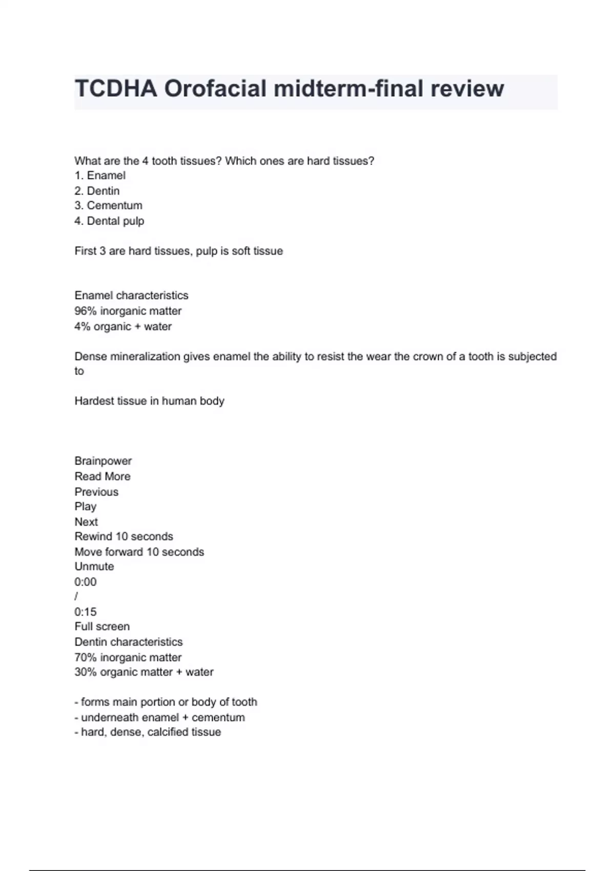 TCDHA Orofacial midterm-final review Exam Questions And Answers What are the 4 tooth tissues? Which ones are hard tissues? 1. Enamel 2. Dentin 3. Cementum 4. Dental pulp First 3 are hard tissues, pulp is soft tissue Enamel characteristics 96% inorganic matter 4% organic + water Dense mineralization gives enamel the ability to resist the wear the crown of a tooth is subjected to Hardest tissue in human body Brainpower Read More Previous Play Next Rewind 10 seconds Move forward 10 seconds Unmute 0:00 / 0:15 Full screen Dentin characteristics 70% inorganic matter 30% organic matter + water - forms main portion or body of tooth - underneath enamel + cementum - hard, dense, calcified tissue - softer than enamel, harder than cementum and bone - yellow in color + elastic in nature There is secondary dentin (adds to itself) and reparative dentin laid in response to trauma Cementum characteristics 45% inorganic, 55% organic matter - bone like substance that covers root - protects and supports tooth What is the main function of cementum? To allow attachment of tooth to alveolar bone Cellular cementum - apical 1/3 of root - can reproduce itself Acellular cementum - covers most of the anatomic root Cementoblasts Cells that produce cementum, *45% inorganic matter Pulp characteristics Housed in center of tooth, with the dentin surrounding the pulp tissue ** nourishing, sensory, dentin-reparative system of tooth What is the pulp composed of? Blood vessels, lymph vessels, connective tissue, nerve tissue (pain), and special *dentin forming cells called *odontoblasts Which teeth are least likely to have proximal root concavities? - max canine - mand central incisor - mand canine - **max central incisor
