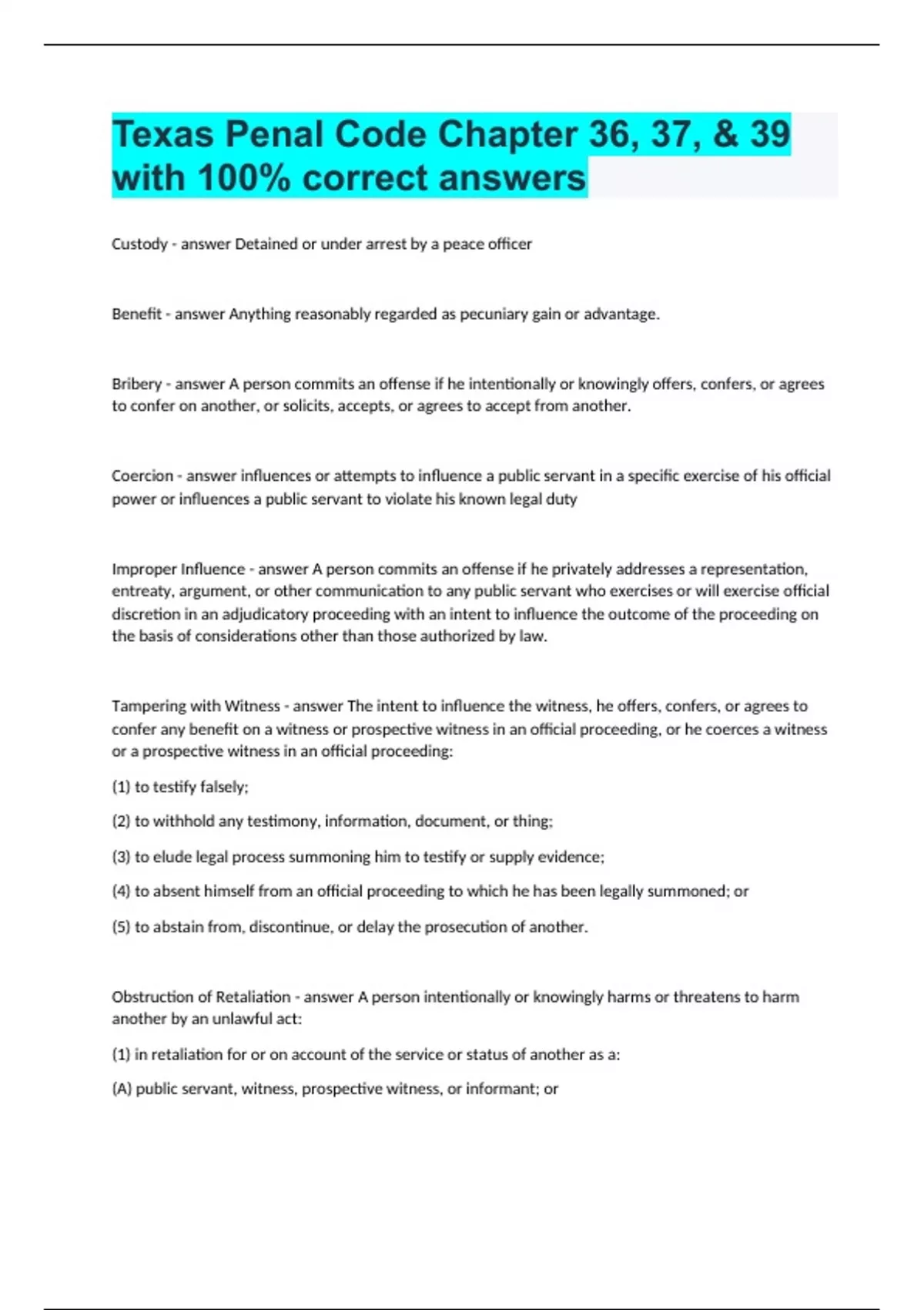 Texas Penal Code Chapter 36, 37, & 39 with 100% correct answers