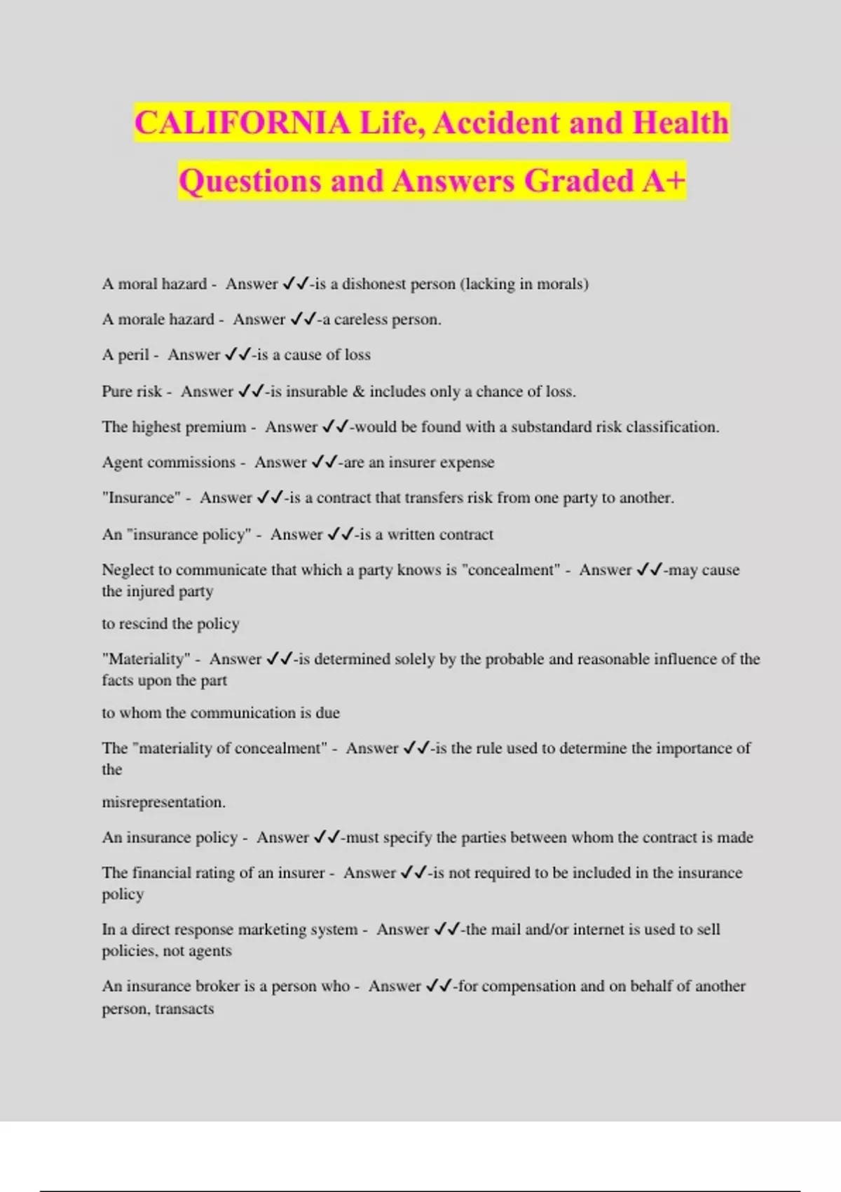 CALIFORNIA Life, Accident and Health Questions and Answers Graded A+ A moral hazard - Answer ️️ -is a dishonest person (lacking in morals) A morale hazard - Answer ️️ -a careless person. A peril - Answer ️️ -is a cause of loss Pure risk - Answer ️️ -is insurable & includes only a chance of loss. The highest premium - Answer ️️ -would be found with a substandard risk classification. Agent commissions - Answer ️️ -are an insurer expense "Insurance" - Answer ️️ -is a contract that transfers risk from one party to another. An "insurance policy" - Answer ️️ -is a written contract Neglect to communicate that which a party knows is "concealment" - Answer ️️ -may cause the injured party to rescind the policy "Materiality" - Answer ️️ -is determined solely by the probable and reasonable influence of the facts upon the part to whom the communication is due The "materiality of concealment" - Answer ️️ -is the rule used to determine the importance of the misrepresentation. An insurance policy - Answer ️️ -must specify the parties between whom the contract is made The financial rating of an insurer - Answer ️️ -is not required to be included in the insurance policy In a direct response marketing system - Answer ️️ -the mail and/or internet is used to sell policies, not agents An insurance broker is a person who - Answer ️️ -for compensation and on behalf of another person, transacts insurance. An insurance agent is a person who - Answer ️️ -for compensation, transacts insurance for the insurer. An insurance solicitor - Answer ️️ -is a person employed by an insurance agent or broker to aid in insurance transactions A person can always use their legal name - Answer ️️ -to transact insurance The state may disapprove the use of any true or fictitious name except - Answer ️️ -a person's legal name An insurance agent or broker hires a third party to prepare their website - Answer ️️ -The insurance agent or broker, not the third party, is responsible for the content of the website. An admitted insurer - Answer ️️ -is an insurer entitled to transact business in this state A mutual insurer - Answer ️️ -is owned by the policyholders and issues particip