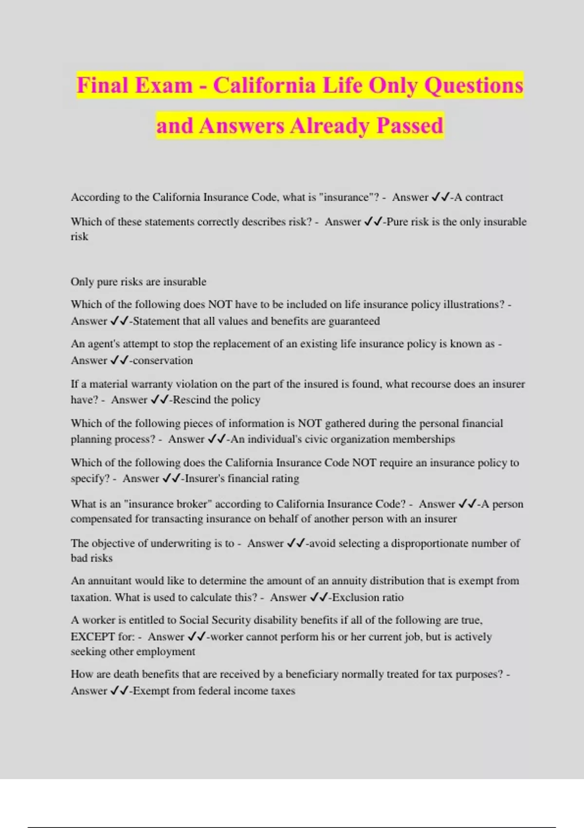 Final Exam - California Life Only Questions and Answers Already Passed According to the California Insurance Code, what is "insurance"? - Answer ️️ -A contract Which of these statements correctly describes risk? - Answer ️️ -Pure risk is the only insurable risk Only pure risks are insurable Which of the following does NOT have to be included on life insurance policy illustrations? - Answer ️️ -Statement that all values and benefits are guaranteed An agent's attempt to stop the replacement of an existing life insurance policy is known as - Answer ️️ -conservation If a material warranty violation on the part of the insured is found, what recourse does an insurer have? - Answer ️️ -Rescind the policy Which of the following pieces of information is NOT gathered during the personal financial planning process? - Answer ️️ -An individual's civic organization memberships Which of the following does the California Insurance Code NOT require an insurance policy to specify? - Answer ️️ -Insurer's financial rating What is an "insurance broker" according to California Insurance Code? - Answer ️️ -A person compensated for transacting insurance on behalf of another person with an insurer The objective of underwriting is to - Answer ️️ -avoid selecting a disproportionate number of bad risks An annuitant would like to determine the amount of an annuity distribution that is exempt from taxation. What is used to calculate this? - Answer ️️ -Exclusion ratio A worker is entitled to Social Security disability benefits if all of the following are true, EXCEPT for: - Answer ️️ -worker cannot perform his or her current job, but is actively seeking other employment How are death benefits that are received by a beneficiary normally treated for tax purposes? - Answer ️️ -Exempt from federal income taxes Which of the following statements correctly describes a contract of indemnity? - Answer ️️ - One party is restored to the same financial position the party was in before the loss occurred How is a life insurance policy dividend legally defined? - Answer ️️ -A return of excess premium and not taxable When handling premiums for an insured, an agent is acting in which capacity? - Answer ️️ - Fiduciary What does the term "illustration" mean when used in the phrase "life insurance policy illustration", according to the California Insurance Code? - Answer ️️ -Presentation of policy features that includes non-guaranteed elements John and Mary have a handicapped child that is financially dependent upon them. The death of one of the parents would not be financially disastrous, however the death of both likely would be. Which policy would be best suited for them? - Answer ️️ -Second-to-die policy Jim is applying to become an insurance agent and has a past misdemeanor conviction that was later expunged due to California Penal Code 1203.4. Which of the following statements is correct? - Answer ️️ -Jim must still disclose the conviction on his insurance license application Which of the following best describes the statement "The more times an event is repeated, the more predictable the outcome becomes"? - Answer ️️ -Law of large numbers Bob and Tom are partners in a business. If one of them were to die, which of the following would guarantee a market for each of their