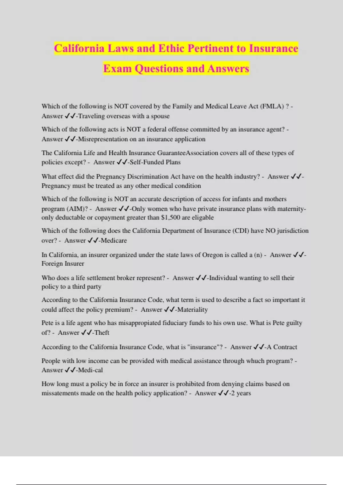 California Laws and Ethic Pertinent to Insurance Exam Questions and Answers Which of the following is NOT covered by the Family and Medical Leave Act (FMLA) ? - Answer ️️ -Traveling overseas with a spouse Which of the following acts is NOT a federal offense committed by an insurance agent? - Answer ️️ -Misrepresentation on an insurance application The California Life and Health Insurance GuaranteeAssociation covers all of these types of policies except? - Answer ️️ -Self-Funded Plans What effect did the Pregnancy Discrimination Act have on the health industry? - Answer ️️ - Pregnancy must be treated as any other medical condition Which of the following is NOT an accurate description of access for infants and mothers program (AIM)? - Answer ️️ -Only women who have private insurance plans with maternity- only deductable or copayment greater than $1,500 are eligable Which of the following does the California Department of Insurance (CDI) have NO jurisdiction over? - Answer ️️ -Medicare In California, an insurer organized under the state laws of Oregon is called a (n) - Answer ️️ - Foreign Insurer Who does a life settlement broker represent? - Answer ️️ -Individual wanting to sell their policy to a third party According to the California Insurance Code, what term is used to describe a fact so important it could affect the policy premium? - Answer ️️ -Materiality Pete is a life agent who has misappropiated fiduciary funds to his own use. What is Pete guilty of? - Answer ️️ -Theft According to the California Insurance Code, what is "insurance"? - Answer ️️ -A Contract People with low income can be provided with medical assistance through whuch program? - Answer ️️ -Medi-cal How long must a policy be in force an insurer is prohibited from denying claims based on missatements made on the health policy application? - Answer ️️ -2 years