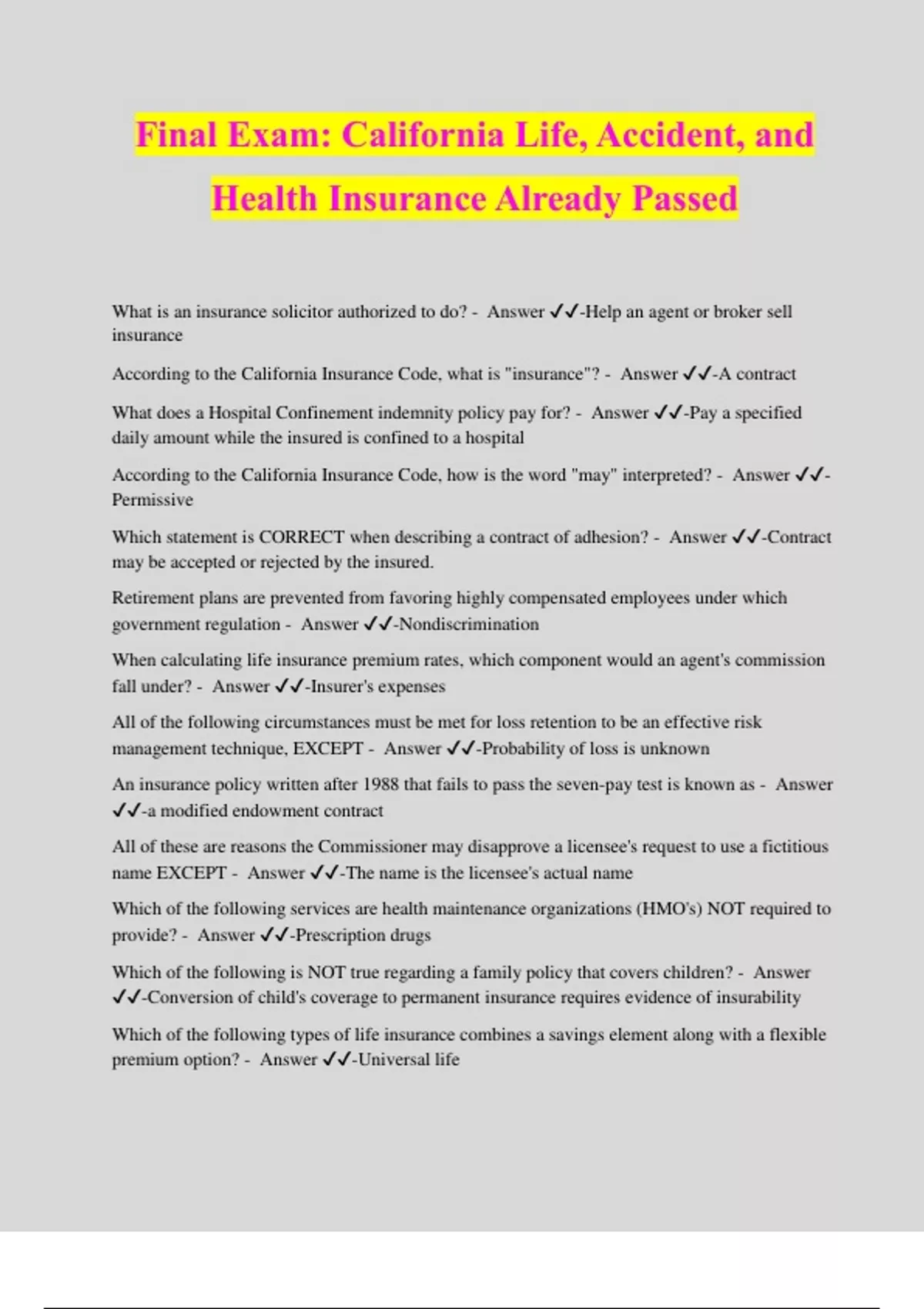 Final Exam: California Life, Accident, and Health Insurance Already Passed