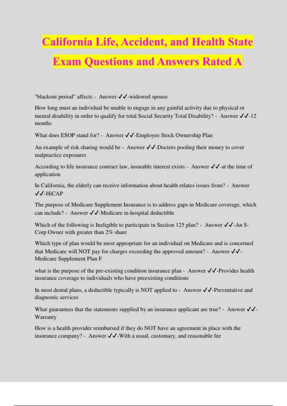 California Life, Accident, and Health State Exam Questions and Answers Rated A "blackout period" affects - Answer ️️ -widowed spouse How long must an individual be unable to engage in any gainful activity due to physical or mental disability in order to qualify for total Social Security Total Disability? - Answer ️️ -12 months What does ESOP stand for? - Answer ️️ -Employee Stock Ownership Plan An example of risk sharing would be - Answer ️️ -Doctors pooling their money to cover malpractice exposures According to life insurance contract law, insurable interest exists - Answer ️️ -at the time of application In California, the elderly can receive information about health relates issues from? - Answer ️️ -HiCAP The purpose of Medicare Supplement Insurance is to address gaps in Medicare coverage, which can include? - Answer ️️ -Medicare in-hospital deductible Which of the following is Ineligible to participate in Section 125 plan? - Answer ️️ -An S- Corp Owner with greater than 2% share Which type of plan would be most appropriate for an individual on Medicare and is concerned that Medicare will NOT pay for charges exceeding the approved amount? - Answer ️️ - Medicare Supplement Plan F what is the purpose of the pre-existing condition insurance plan - Answer ️️ -Provides health insurance coverage to individuals who have preexisting conditions In most dental plans, a deductible typically is NOT applied to - Answer ️️ -Preventative and diagnostic services What guarantees that the statements supplied by an insurance applicant are true? - Answer ️️ - Warranty How is a health provider reimbursed if they do NOT have an agreement in place with the insurance company? - Answer ️️ -With a usual, customary, and reasonable fee A provision in a whole life policy that allows a policyowner to terminate the policy in return for a reduced paid-up policy of the same type is called a(n) - Answer ️️ -nonforfeiture provision Which of these statements regarding the annuitant is CORRECT? - Answer ️️ -The annuitant's life expectancy determines the annuity payments Dishonest tendencies that increase the probability of loss are what types of hazard? - Answer ️️ -Moral Hazard What is required after a life insurance agent sells an insurance policy to an applicant without being appointed by the insurer? - Answer ️️ -Notice of appointment must be submitted to the Commissioner. "policy" is defined as - Answer ️️ -written contract What is a corridor in relation to a Universal Life insurance policy? - Answer ️️ -the gap between the total death benefit and the policy's cas