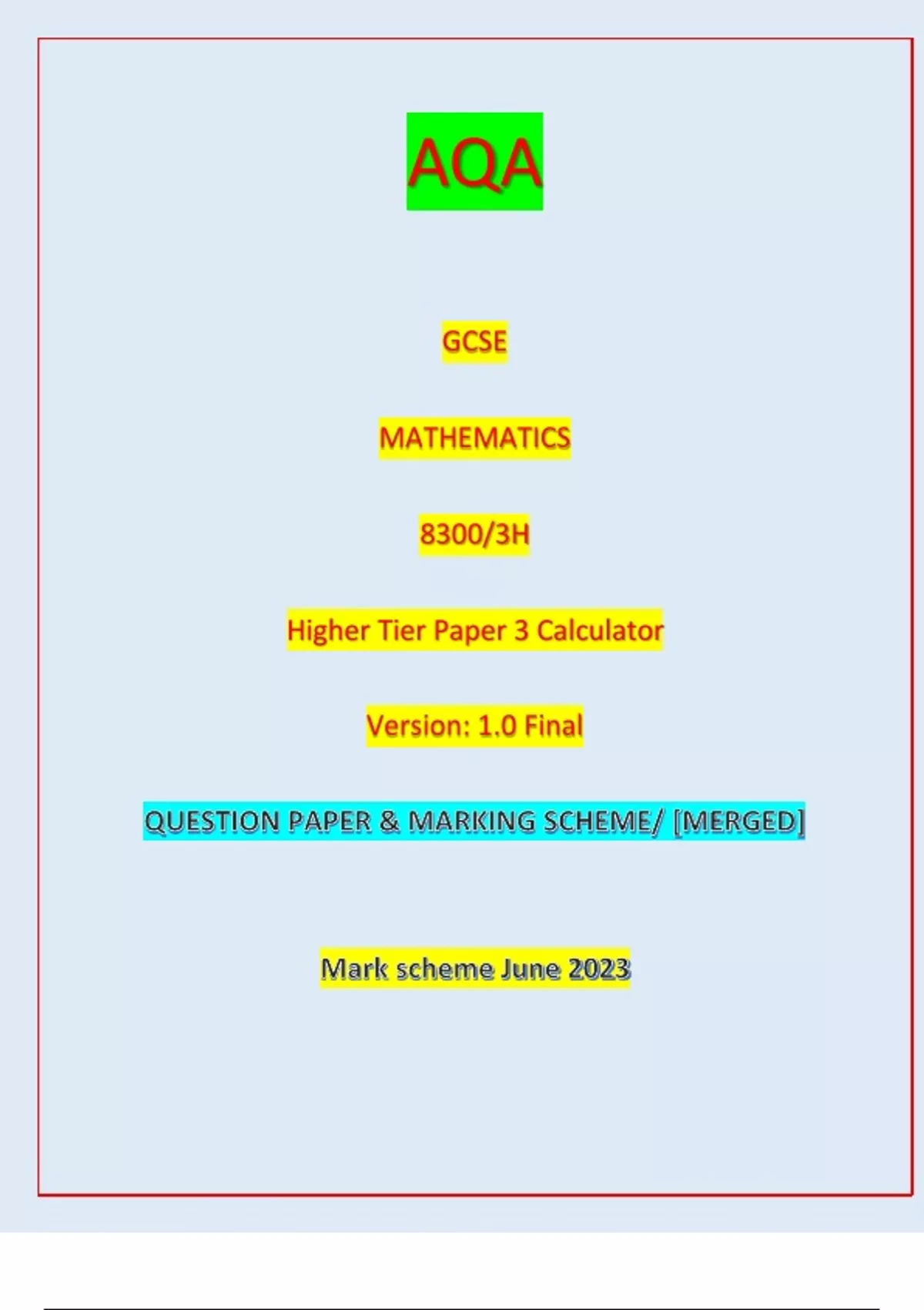 AQA GCSE MATHEMATICS 8300/3H Higher Tier Paper 3 Calculator Version: 1.0 Final *jun2383003H01* IB/M/Jun23/E8 8300/3H QUESTION PAPER & MARKING SCHEME/ [MERGED]