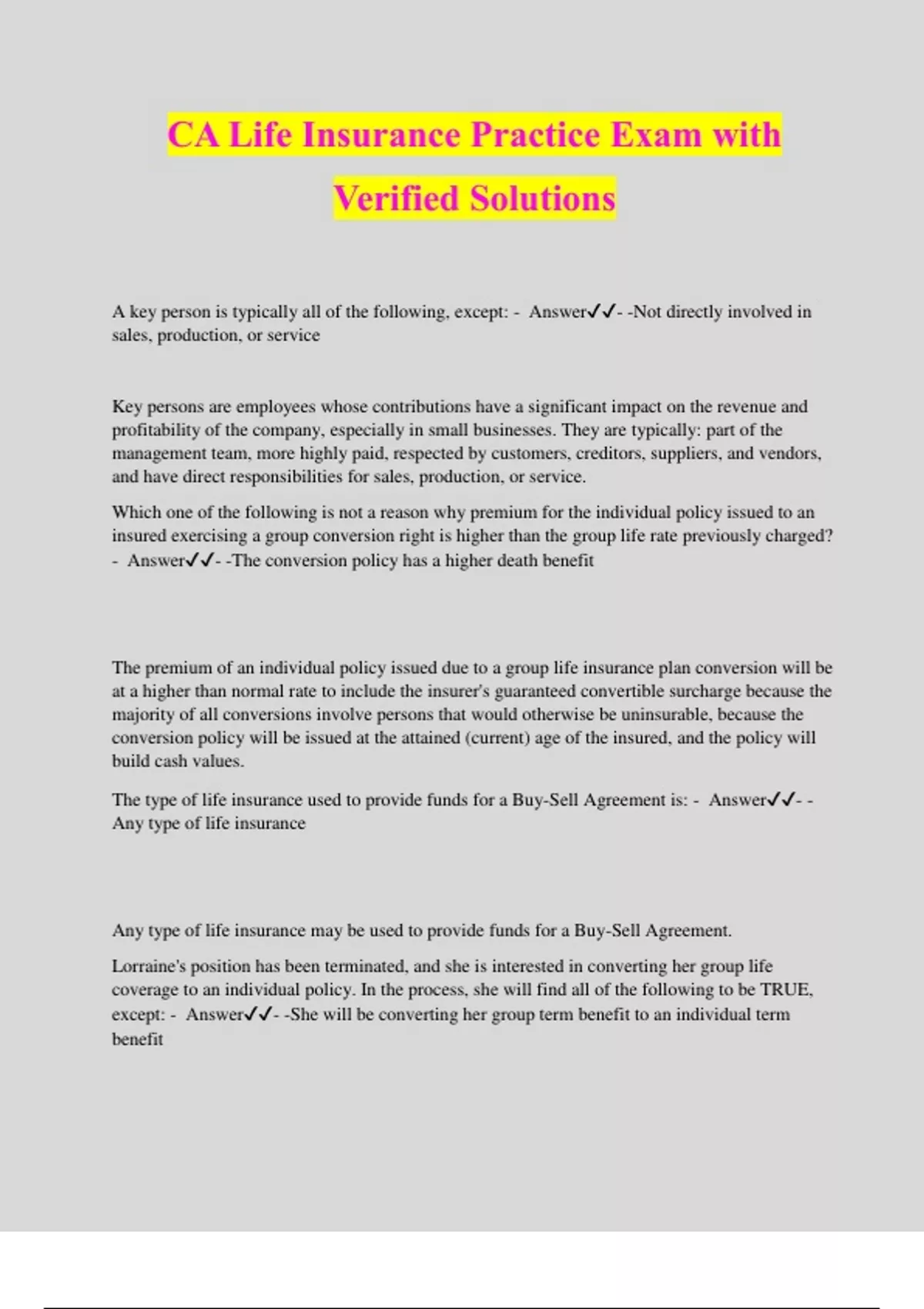 CA Life Insurance Practice Exam with Verified Solutions A key person is typically all of the following, except: - Answer️️ - -Not directly involved in sales, production, or service Key persons are employees whose contributions have a significant impact on the revenue and profitability of the company, especially in small businesses. They are typically: part of the management team, more highly paid, respected by customers, creditors, suppliers, and vendors, and have direct responsibilities for sales, production, or service. Which one of the following is not a reason why premium for the individual policy issued to an insured exercising a group conversion right is higher than the group life rate previously charged? - Answer️️ - -The conversion policy has a higher death benefit The premium of an individual policy issued due to a group life insurance plan conversion will be at a higher than normal rate to include the insurer's guaranteed convertible surcharge because the majority of all conversions involve persons that would otherwise be uninsurable, because the conversion policy will be issued at the attained (current) age of the insured, and the policy will build cash values. The type of life insurance used to provide funds for a Buy-Sell Agreement is: - Answer️️ - - Any type of life insurance Any type of life insurance may be used to provide funds for a Buy-Sell Agreement. Lorraine's position has been terminated, and she is interested in converting her group life coverage to an individual policy. In the process, she will find all of the following to be TRUE, except: - Answer️️ - -She will be converting her group term benefit to an individual term benefit She will be converting her group term life to an individual permanent policy. To help protect against experiencing immediate claims, group plans have a(n) _______ period set up by the group sponsor. - Answer️️ - -Probationary A probationary period is set up to help reduce the chance of facing immediate claims. How is the funding for Social Security provided? - Answer️️ - -Through FICA taxes that are paid by both employers and employees Both the employer and employee fund Social Security through paying FICA taxes. Self- employed persons pay the entire amount. The premium for optional dependent group insurance can be payable by: - Answer️️ - The employer, the employee or both Optional dependent coverage may be paid for by the employer, the employee, or both. When an insurer wishes to implement changes to a group life policy, whom must it notify? - Answer️️ - The group spons