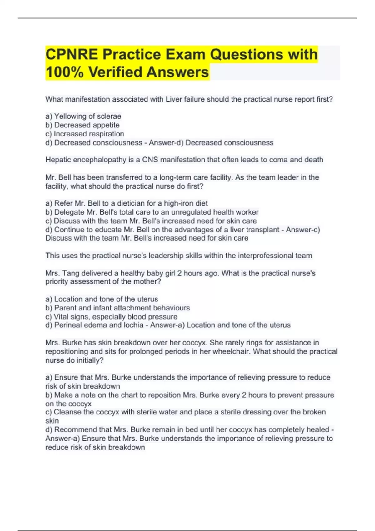 CPNRE Practice Exam Questions with 100% Verified Answers What manifestation associated with Liver failure should the practical nurse report first? a) Yellowing of sclerae b) Decreased appetite c) Increased respiration d) Decreased consciousness - Answer-d) Decreased consciousness Hepatic encephalopathy is a CNS manifestation that often leads to coma and death Mr. Bell has been transferred to a long-term care facility. As the team leader in the facility, what should the practical nurse do first? a) Refer Mr. Bell to a dietician for a high-iron diet b) Delegate Mr. Bell's total care to an unregulated health worker c) Discuss with the team Mr. Bell's increased need for skin care d) Continue to educate Mr. Bell on the advantages of a liver transplant - Answer-c) Discuss with the team Mr. Bell's increased need for skin care This uses the practical nurse's leadership skills within the interprofessional team Mrs. Tang delivered a healthy baby girl 2 hours ago. What is the practical nurse's priority assessment of the mother? a) Location and tone of the uterus b) Parent and infant attachment behaviours c) Vital signs, especially blood pressure d) Perineal edema and lochia - Answer-a) Location and tone of the uterus Mrs. Burke has skin breakdown over her coccyx. She rarely rings for assistance in repositioning and sits for prolonged periods in her wheelchair. What should the practical nurse do initially? a) Ensure that Mrs. Burke understands the importance of relieving pressure to reduce risk of skin breakdown b) Make a note on the chart to reposition Mrs. Burke every 2 hours to prevent pressure on the coccyx c) Cleanse the coccyx with sterile water and place a sterile dressing over the broken skin d) Recommend that Mrs. Burke remain in bed until her coccyx has completely healed - Answer-a) Ensure that Mrs. Burke understands the importance of relieving pressure to reduce risk of skin breakdown Mrs. Burke tells the practical nurse that she suddenly has a headache and feels nauseous. She is diaphoretic and her face is flushed. Mrs. Burke's blood pressure is assessed and is now significantly elevated. What should the practical nurse do? a) Check her temperature, heart rate and respiration and administer a p.r.n. analgesic b) Reassess Mrs. Burke's vital signs and assess the urinary drainage system c) Place her in the Trendelenburg position and administer an antiemetic medication d) Perform a neurological assessment prior to notifying the physician - Answer-b) Reassess Mrs. Burke's vital signs and assess the urinary drainage system She's presenting with manifestations of autonomic dysreflexia which can be fatal if the triggering stimulus is not removed as quickly as possible The physician's order reads intermediate-duration insulin NPH (Novolin ge NPH) 36 units with regular insulin 12 units subcutaneously. What process should the practical nurse use?