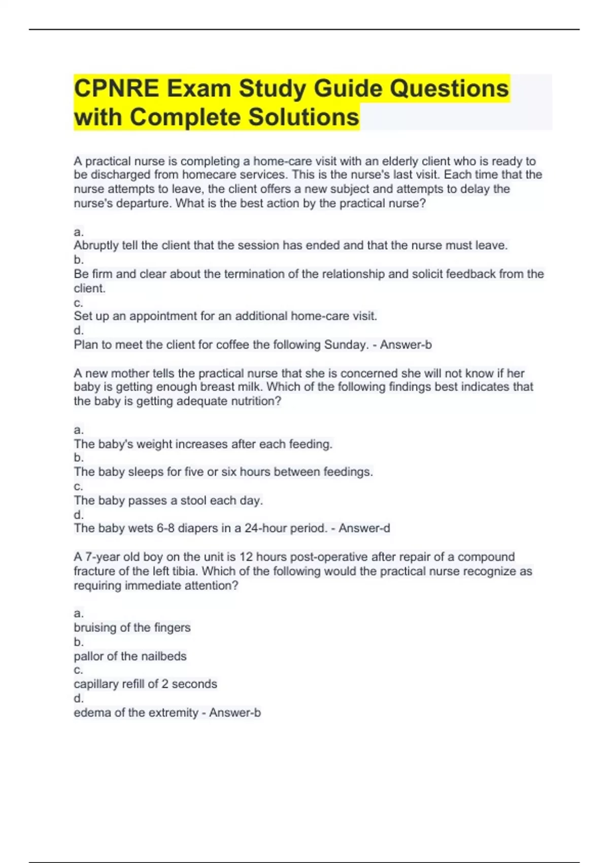 CPNRE Exam Study Guide Questions with Complete Solutions A practical nurse is completing a home-care visit with an elderly client who is ready to be discharged from homecare services. This is the nurse's last visit. Each time that the nurse attempts to leave, the client offers a new subject and attempts to delay the nurse's departure. What is the best action by the practical nurse? a. Abruptly tell the client that the session has ended and that the nurse must leave. b. Be firm and clear about the termination of the relationship and solicit feedback from the client. c. Set up an appointment for an additional home-care visit. d. Plan to meet the client for coffee the following Sunday. - Answer-b A new mother tells the practical nurse that she is concerned she will not know if her baby is getting enough breast milk. Which of the following findings best indicates that the baby is getting adequate nutrition? a. The baby's weight increases after each feeding. b. The baby sleeps for five or six hours between feedings. c. The baby passes a stool each day. d. The baby wets 6-8 diapers in a 24-hour period. - Answer-d A 7-year old boy on the unit is 12 hours post-operative after repair of a compound fracture of the left tibia. Which of the following would the practical nurse recognize as requiring immediate attention? a. bruising of the fingers b. pallor of the nailbeds c. capillary refill of 2 seconds d. edema of the extremity - Answer-b The practical nurse is preparing an intradermal injection. Which of the following angles is the recommended angle for insertion? a. 5-15 degress b. 45-90 degrees c. 30-45 degrees d. 20-30 degrees - Answer-a Mr. Williams, 27-year-old, is being discharged home following outpatient surgery. The physician has provided a prescription for Tylenol #3, p.o. q4h prn for pain. Which of the following discharge instructions are most important? a.