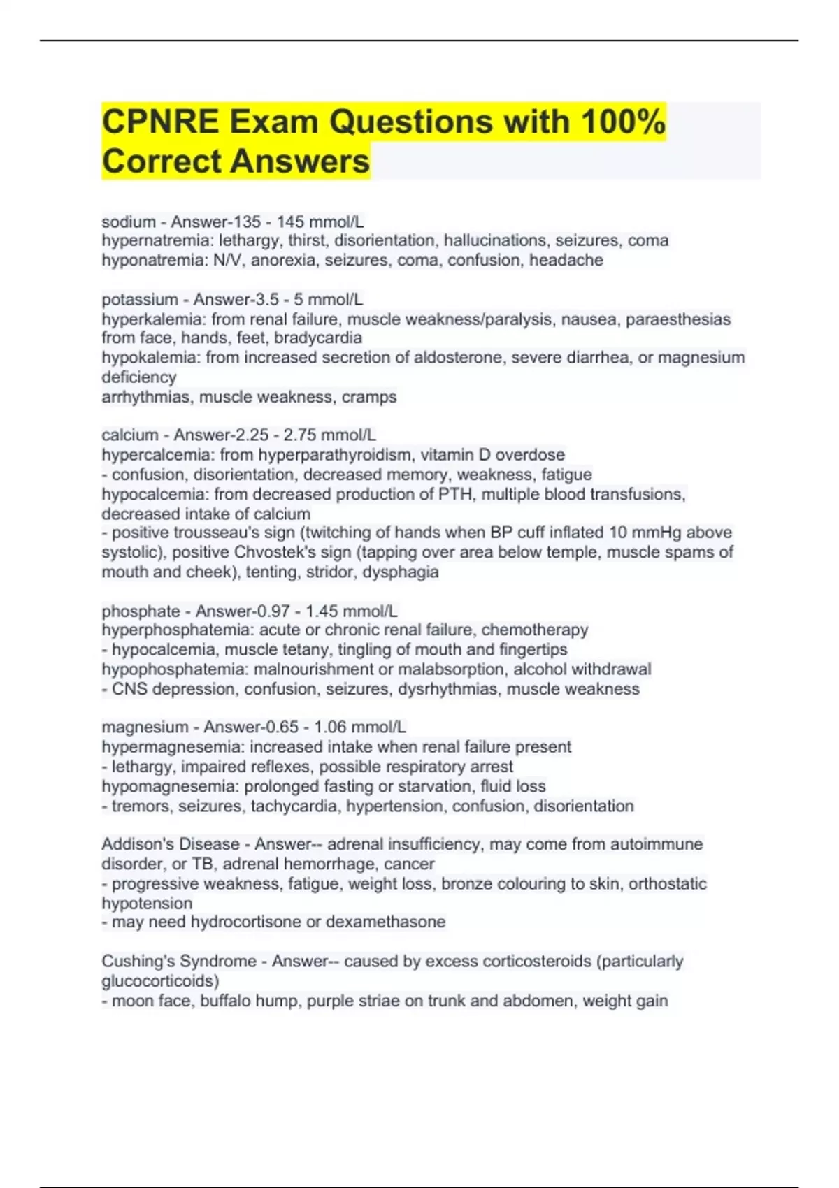 CPNRE Exam Questions with 100% Correct Answers sodium - Answer-135 - 145 mmol/L hypernatremia: lethargy, thirst, disorientation, hallucinations, seizures, coma hyponatremia: N/V, anorexia, seizures, coma, confusion, headache potassium - Answer-3.5 - 5 mmol/L hyperkalemia: from renal failure, muscle weakness/paralysis, nausea, paraesthesias from face, hands, feet, bradycardia hypokalemia: from increased secretion of aldosterone, severe diarrhea, or magnesium deficiency arrhythmias, muscle weakness, cramps calcium - Answer-2.25 - 2.75 mmol/L hypercalcemia: from hyperparathyroidism, vitamin D overdose - confusion, disorientation, decreased memory, weakness, fatigue hypocalcemia: from decreased production of PTH, multiple blood transfusions, decreased intake of calcium - positive trousseau's sign (twitching of hands when BP cuff inflated 10 mmHg above systolic), positive Chvostek's sign (tapping over area below temple, muscle spams of mouth and cheek), tenting, stridor, dysphagia phosphate - Answer-0.97 - 1.45 mmol/L hyperphosphatemia: acute or chronic renal failure, chemotherapy - hypocalcemia, muscle tetany, tingling of mouth and fingertips hypophosphatemia: malnourishment or malabsorption, alcohol withdrawal - CNS depression, confusion, seizures, dysrhythmias, muscle weakness magnesium - Answer-0.65 - 1.06 mmol/L hypermagnesemia: increased intake when renal failure present - lethargy, impaired reflexes, possible respiratory arrest hypomagnesemia: prolonged fasting or starvation, fluid loss - tremors, seizures, tachycardia, hypertension, confusion, disorientation Addison's Disease - Answer-- adrenal insufficiency, may come from autoimmune disorder, or TB, adrenal hemorrhage, cancer