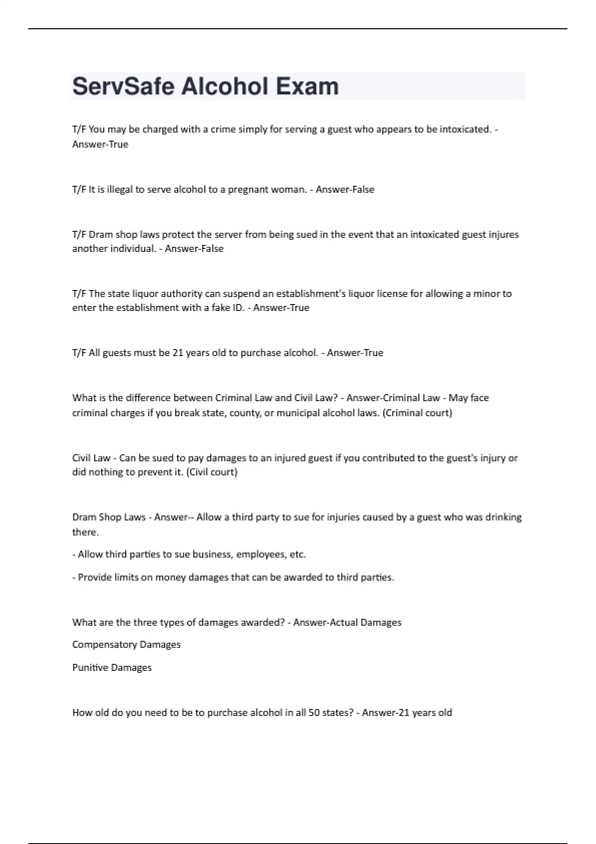 T/F You may be charged with a crime simply for serving a guest who appears to be intoxicated. - Answer-True T/F It is illegal to serve alcohol to a pregnant woman. - Answer-False T/F Dram shop laws protect the server from being sued in the event that an intoxicated guest injures another individual. - Answer-False T/F The state liquor authority can suspend an establishment's liquor license for allowing a minor to enter the establishment with a fake ID. - Answer-True T/F All guests must be 21 years old to purchase alcohol. - Answer-True What is the difference between Criminal Law and Civil Law? - Answer-Criminal Law - May face criminal charges if you break state, county, or municipal alcohol laws. (Criminal court) Civil Law - Can be sued to pay damages to an injured guest if you contributed to the guest's injury or did nothing to prevent it. (Civil court) Dram Shop Laws - Answer-- Allow a third party to sue for injuries caused by a guest who was drinking there. - Allow third parties to sue business, employees, etc. - Provide limits on money damages that can be awarded to third parties. What are the three types of damages awarded? - Answer-Actual Damages Compensatory Damages Punitive Damages How old do you need to be to purchase alcohol in all 50 states? - Answer-21 years oldWho is alcohol authority? - Answer-State or municipal agency that enforces alcohol regulations and licensing laws. - Often called ABC (Alcohol Beverage Control) When are you allowed to serve alcohol? - Answer-9AM - 2AM How old do you have to be to serve alcohol? - Answer-18 Years Old State or municipal liquor authorities can issue citations for a) drunk driving b) serving a pregnant woman c) serving alcohol to a minor d) fighting in the establishment - Answer-C
