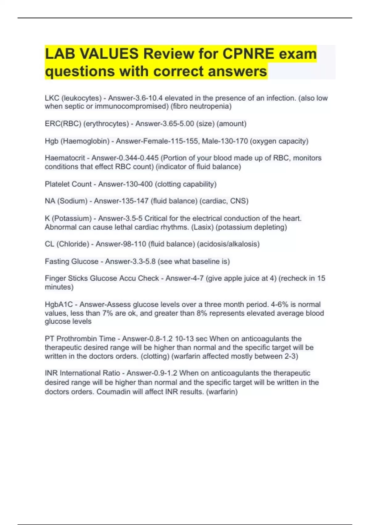 LAB VALUES Review for CPNRE exam questions with correct answers LKC (leukocytes) - Answer-3.6-10.4 elevated in the presence of an infection. (also low when septic or immunocompromised) (fibro neutropenia) ERC(RBC) (erythrocytes) - Answer-3.65-5.00 (size) (amount) Hgb (Haemoglobin) - Answer-Female-115-155, Male-130-170 (oxygen capacity) Haematocrit - Answer-0.344-0.445 (Portion of your blood made up of RBC, monitors conditions that effect RBC count) (indicator of fluid balance) Platelet Count - Answer-130-400 (clotting capability) NA (Sodium) - Answer-135-147 (fluid balance) (cardiac, CNS) K (Potassium) - Answer-3.5-5 Critical for the electrical conduction of the heart. Abnormal can cause lethal cardiac rhythms. (Lasix) (potassium depleting) CL (Chloride) - Answer-98-110 (fluid balance) (acidosis/alkalosis) Fasting Glucose - Answer-3.3-5.8 (see what baseline is) Finger Sticks Glucose Accu Check - Answer-4-7 (give apple juice at 4) (recheck in 15 minutes) HgbA1C - Answer-Assess glucose levels over a three month period. 4-6% is normal values, less than 7% are ok, and greater than 8% represents elevated average blood glucose levels PT Prothrombin Time - Answer-0.8-1.2 10-13 sec When on anticoagulants the therapeutic desired range will be higher than normal and the specific target will be written in the doctors orders. (clotting) (warfarin affected mostly between 2-3) INR International Ratio - Answer-0.9-1.2 When on anticoagulants the therapeutic desired range will be higher than normal and the specific target will be written in the doctors orders. Coumadin will affect INR results. (warfarin)