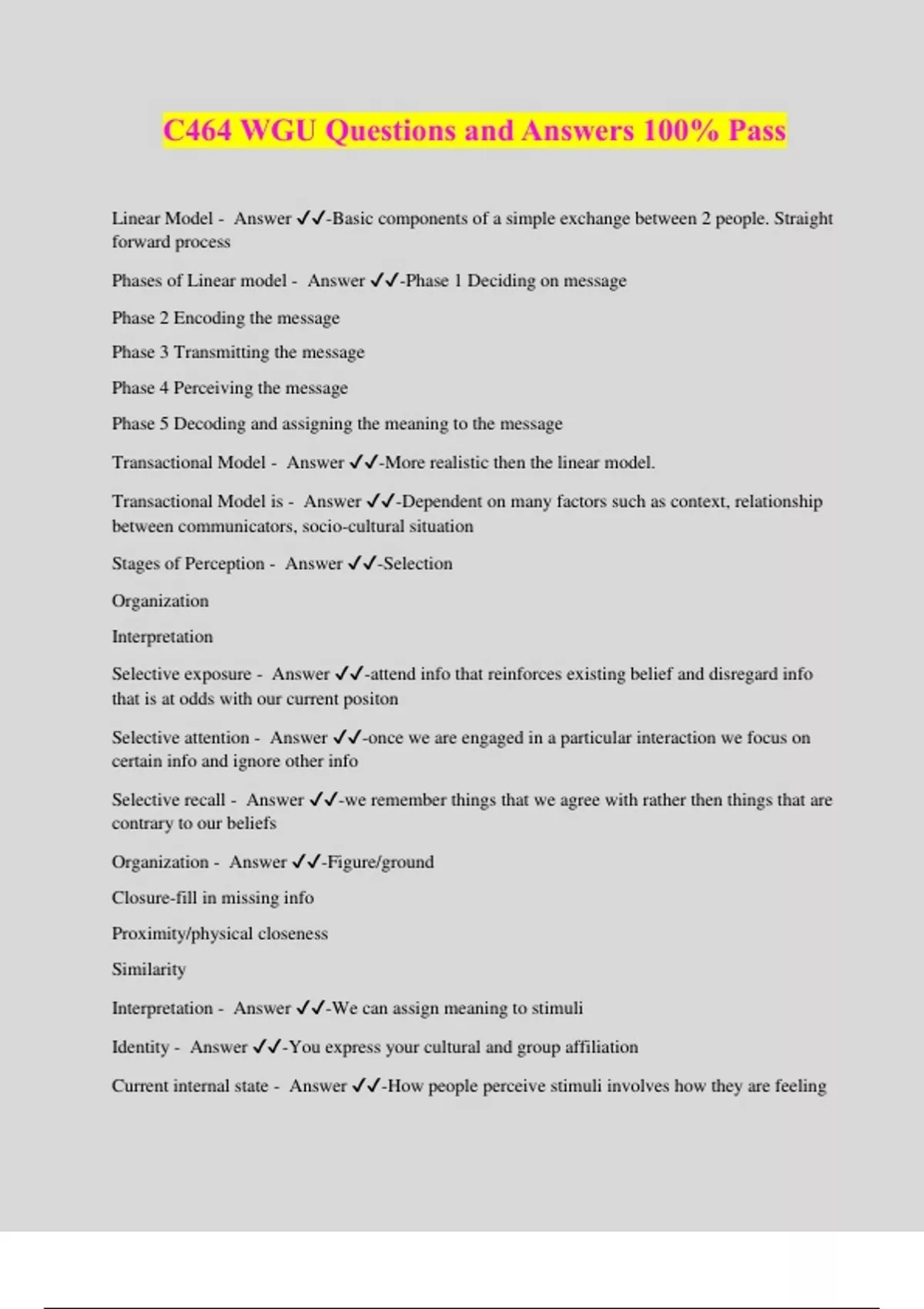 C464 WGU Questions and Answers 100% Pass Linear Model - Answer ️️ -Basic components of a simple exchange between 2 people. Straight forward process Phases of Linear model - Answer ️️ -Phase 1 Deciding on message Phase 2 Encoding the message Phase 3 Transmitting the message Phase 4 Perceiving the message Phase 5 Decoding and assigning the meaning to the message Transactional Model - Answer ️️ -More realistic then the linear model. Transactional Model is - Answer ️️ -Dependent on many factors such as context, relationship between communicators, socio-cultural situation Stages of Perception - Answer ️️ -Selection Organization Interpretation Selective exposure - Answer ️️ -attend info that reinforces existing belief and disregard info that is at odds with our current positon Selective attention - Answer ️️ -once we are engaged in a particular interaction we focus on certain info and ignore other info Selective recall - Answer ️️ -we remember things that we agree with rather then things that are contrary to our beliefs Organization - Answer ️️ -Figure/ground Closure-fill in missing info Proximity/physical closeness Similarity Interpretation - Answer ️️ -We can assign meaning to stimuli Identity - Answer ️️ -You express your cultural and group affiliation Current internal state - Answer ️️ -How people perceive stimuli involves how they are feeling Locus of causation - Answer ️️ -Refers to whether the communicators behavior was motivated by an internal state or an external state Self-presentation - Answer ️️ -Strategic development and use of verbal and non verbal messages that result others making conclusions about the kind of individual you are Impression management - Answer ️️ -Deliberate use of verbal/nonverbal messages to create a particular impression among others Plan for Effective Self-presentat