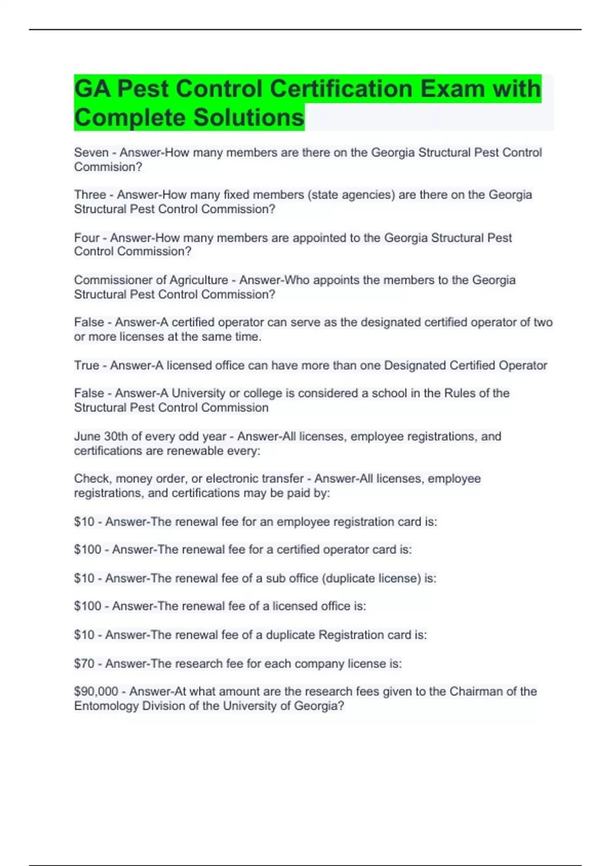 GA Pest Control Certification Exam with Complete Solutions