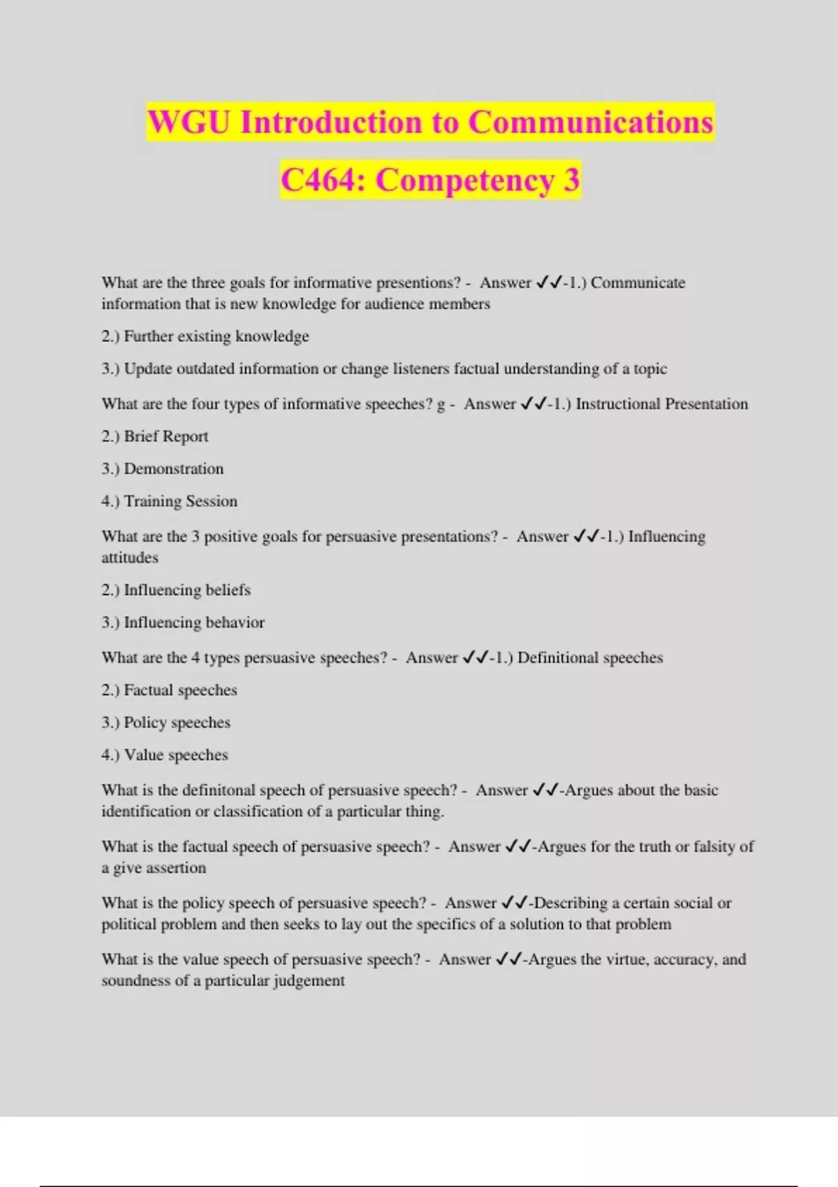 WGU Introduction to Communications C464: Competency 3 What are the three goals for informative presentions? - Answer ️️ -1.) Communicate information that is new knowledge for audience members 2.) Further existing knowledge 3.) Update outdated information or change listeners factual understanding of a topic What are the four types of informative speeches? g - Answer ️️ -1.) Instructional Presentation 2.) Brief Report 3.) Demonstration 4.) Training Session What are the 3 positive goals for persuasive presentations? - Answer ️️ -1.) Influencing attitudes 2.) Influencing beliefs 3.) Influencing behavior What are the 4 types persuasive speeches? - Answer ️️ -1.) Definitional speeches 2.) Factual speeches