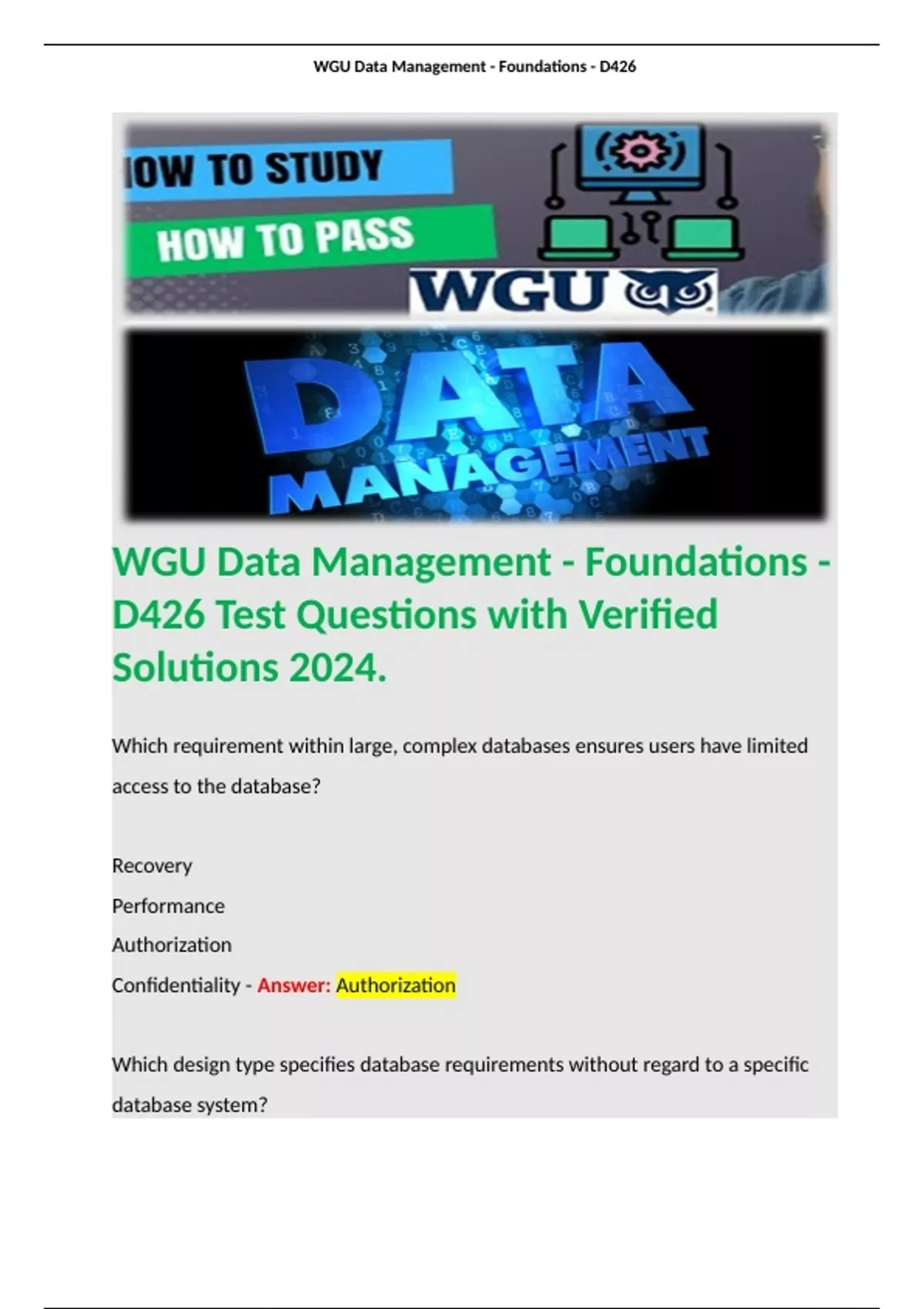WGU Data Management - Foundations - D426 Test Questions with Verified Solutions 2024. Terms like: Which requirement within large, complex databases ensures users have limited access to the database? Recovery Performance Authorization Confidentiality - Answer: Authorization
