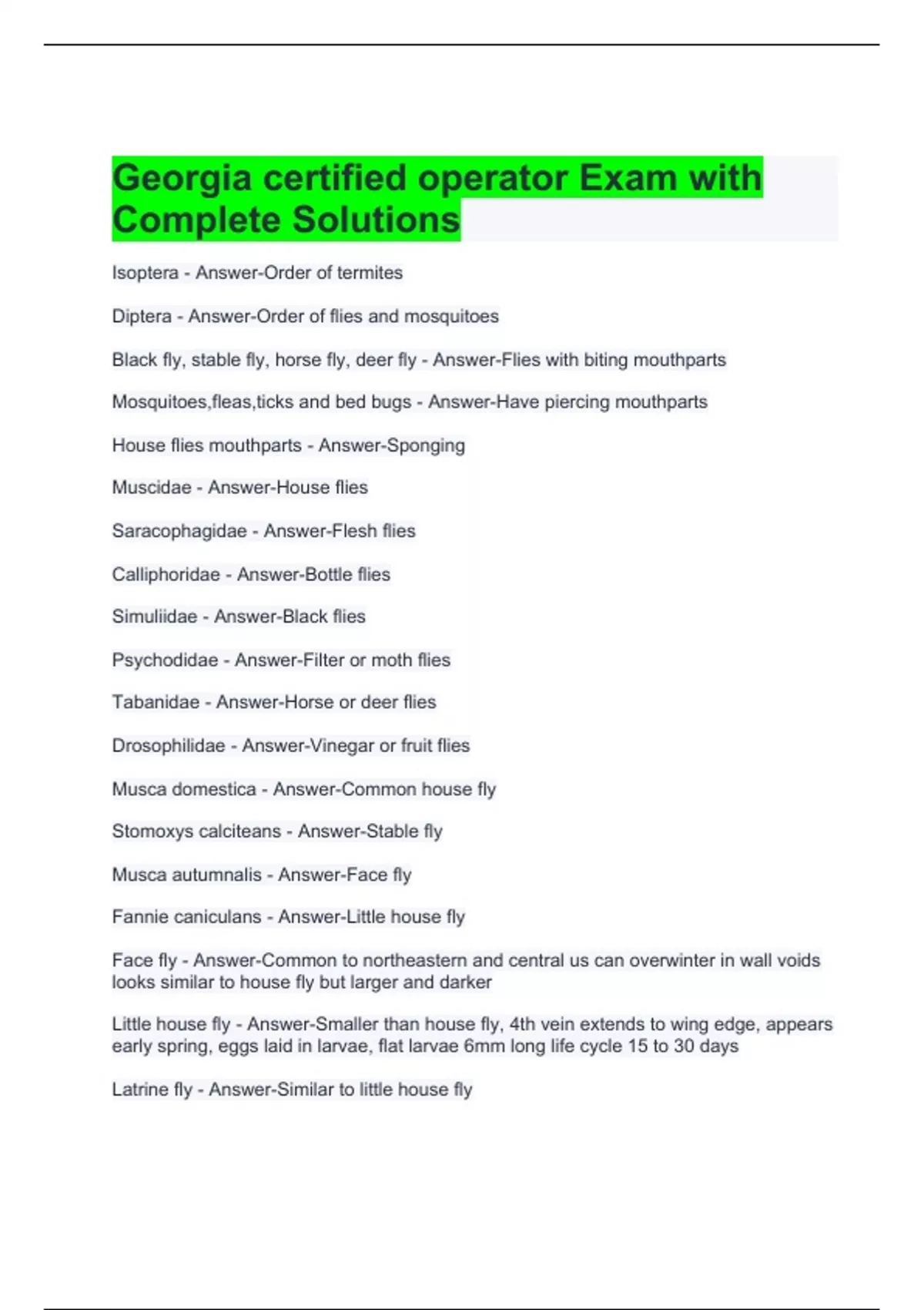 Latrine fly - Answer-Similar to little house fly Flesh flies - Answer-Much larger than house flies, common in dog runs