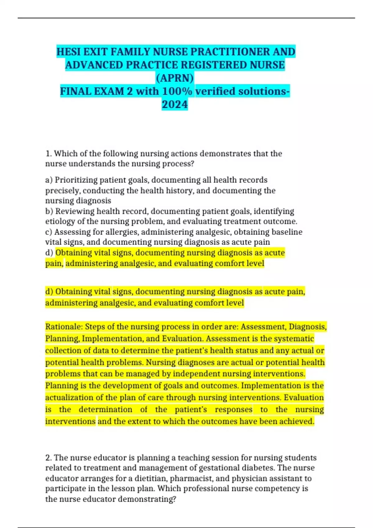 HESI EXIT FAMILY NURSE PRACTITIONER AND ADVANCED PRACTICE REGISTERED NURSE (APRN) FINAL EXAM 2 with 100% verified solutions- 2024