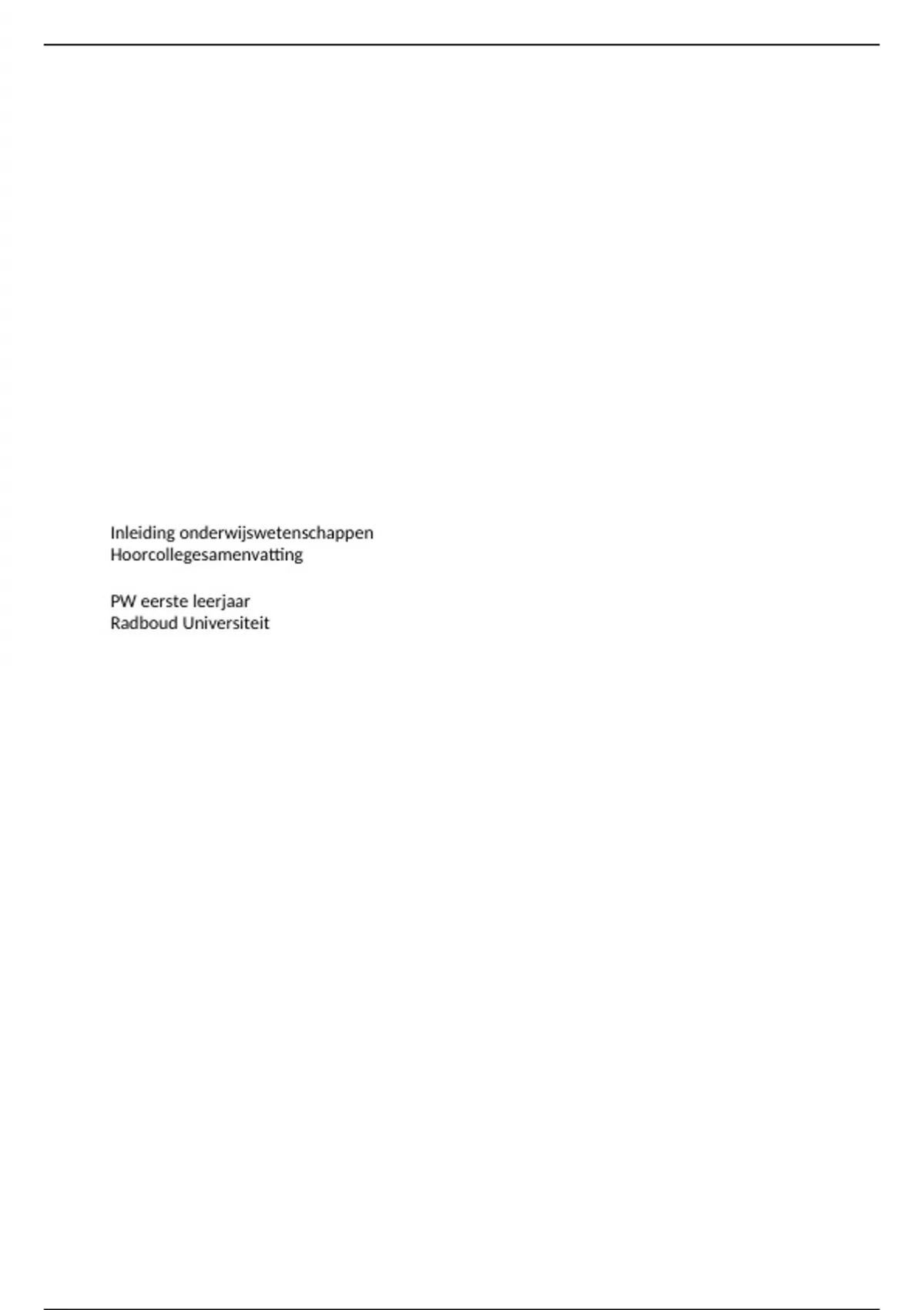 Duidelijke en complete samenvatting van het vak Inleiding Onderwijswetenschappen. Het is een lastig tentamen, dus zorg dat je de colleges goed kent! Succes met leren.