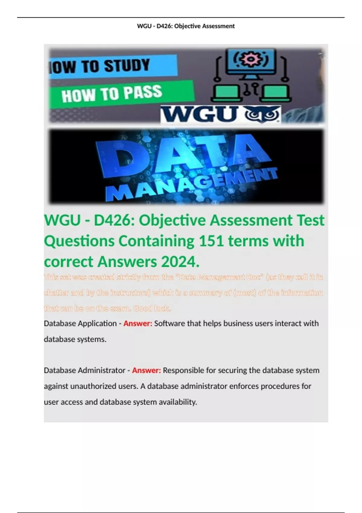 WGU - D426: Objective Assessment Test Questions Containing 151 terms with correct Answers 2024. This set was created strictly from the "Data Management Doc" (as they call it in chatter and by the instructors) which is a summary of (most) of the information that can be on the exam. Good luck